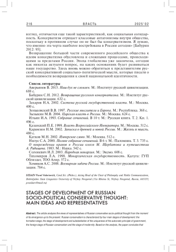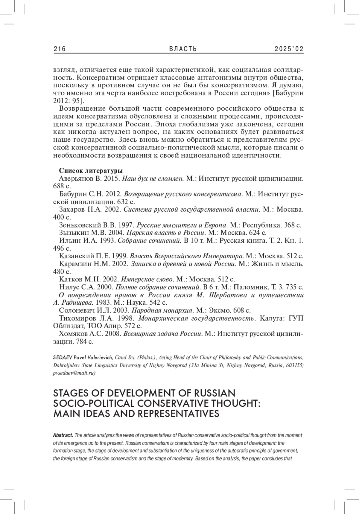 2. Бабурин С.Н. 2012. Возвращение русского консерватизма. М.: Институт русской цивилизации. 632 с. EDN: QPXCWV