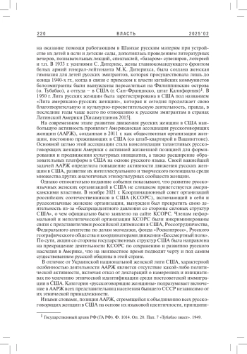 В статье проводится анализ создания и важнейших моментов в истории развития женских организаций, представляющих наиболее многочисленные диаспоры русскоязычного сообщества в США - русских и украинцев. Основной акцент делается на идеологии в деятельности женских организаций, касающейся в т. ч. и сохранения этнокультурной идентичности в рамках русской и украинской диаспор. В качестве условий формирования идеологии женских организаций в иммиграции рассматриваются исторические события, тем или иным способом повлиявшие на этот процесс. Особое внимание уделяется установлению различий в деятельности русских и украинских женских организаций, их целеполаганию и видам деятельности. Автор акцентирует активную деятельность украинских женских организаций по интеграции в международные и американские феминистские структуры, а также развитие институциональных форм сотрудничества с политическими организациями в США.