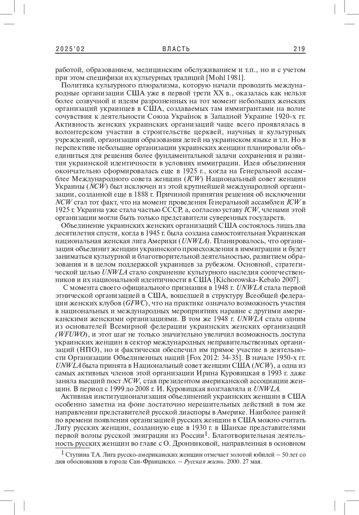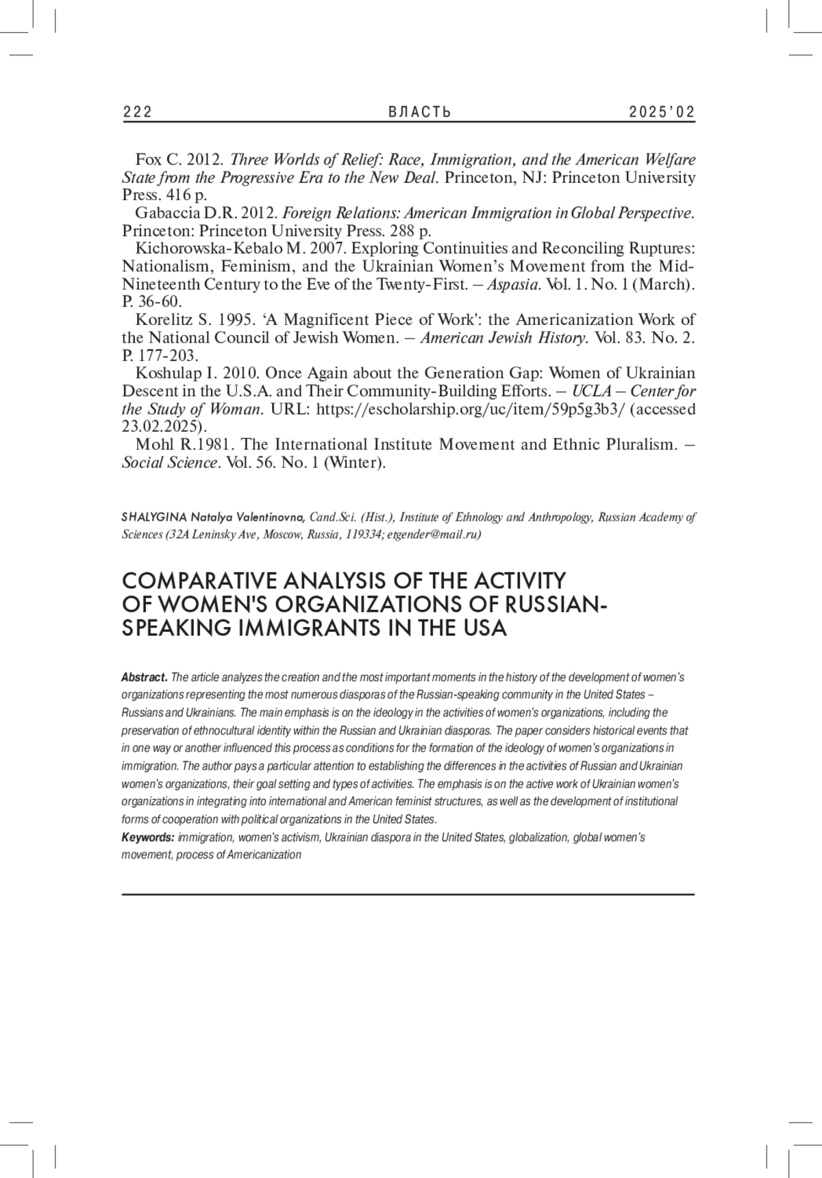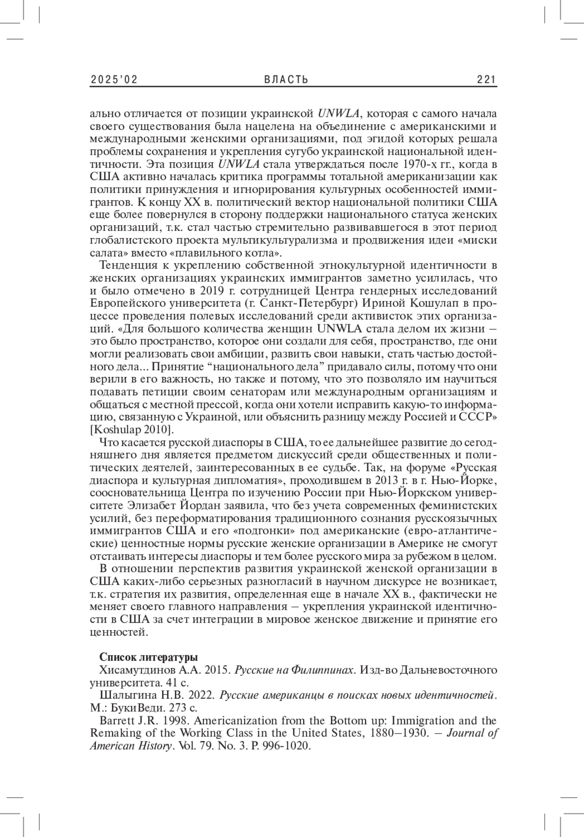 8. 	Koshulap I. 2010. Once Again about the Generation Gap: Women of Ukrainian Descent in the U.S.A. and Their Community-Building Efforts. - UCLA - Center for the Study of Woman. URL: https://escholarship.org/uc/item/59p5g3b3/(accessed 23.02.2025).