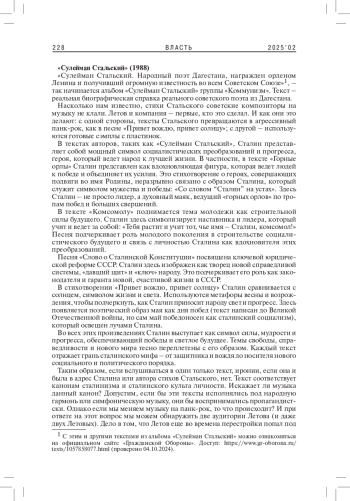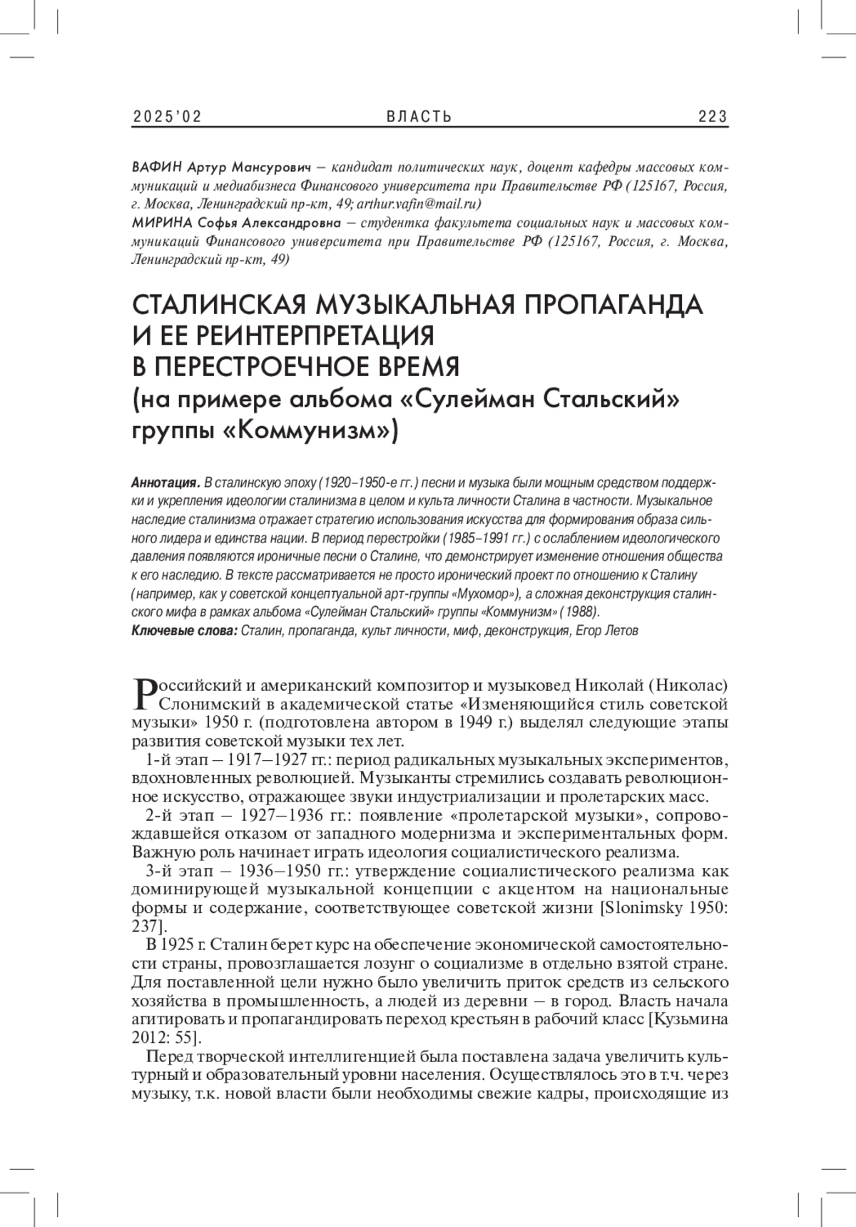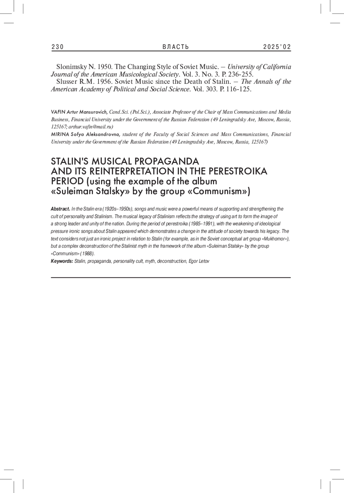 В сталинскую эпоху (1920-1950-е гг.) песни и музыка были мощным средством поддержки и укрепления идеологии сталинизма в целом и культа личности Сталина в частности. Музыкальное наследие сталинизма отражает стратегию использования искусства для формирования образа сильного лидера и единства нации. В период перестройки (1985-1991 гг.) с ослаблением идеологического давления появляются ироничные песни о Сталине, что демонстрирует изменение отношения общества к его наследию. В тексте рассматривается не просто иронический проект по отношению к Сталину (например, как у советской концептуальной арт-группы «Мухомор»), а сложная деконструкция сталинского мифа в рамках альбома «Сулейман Стальский» группы «Коммунизм» (1988).