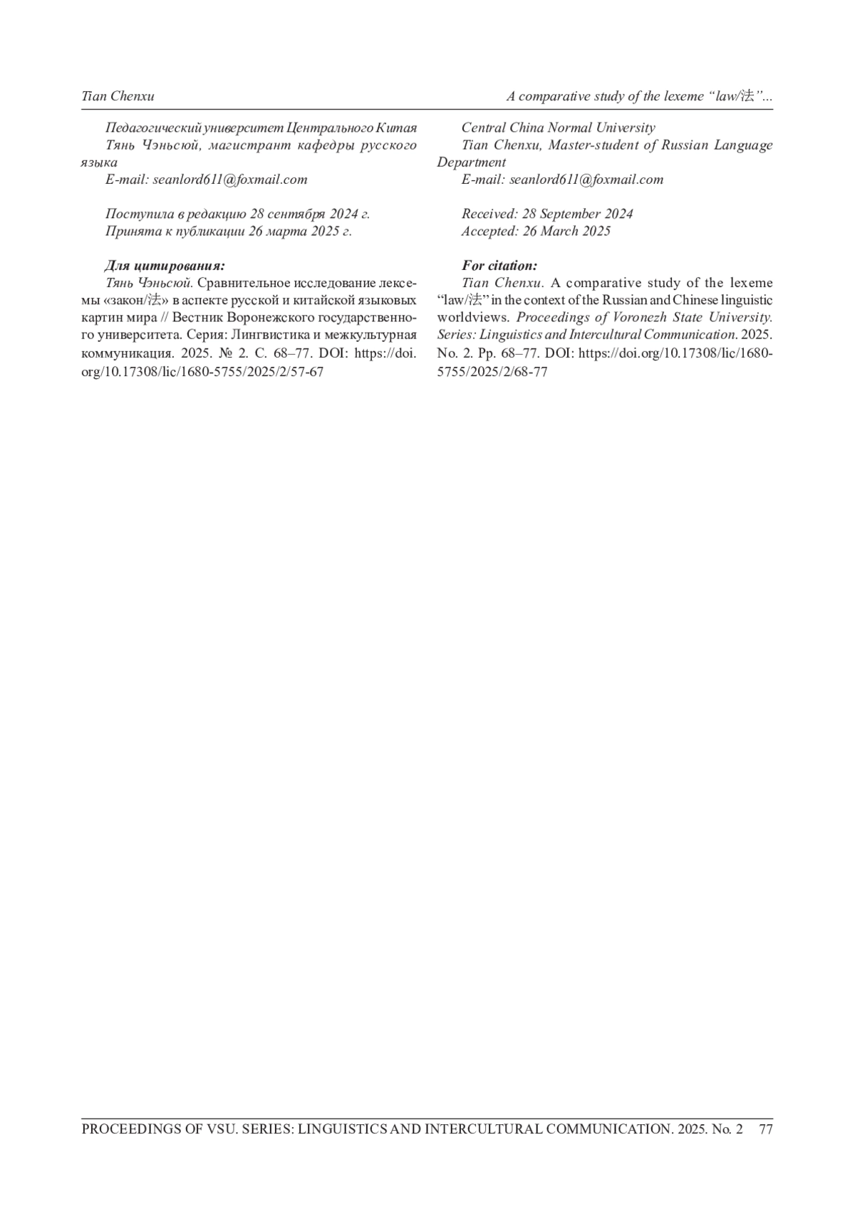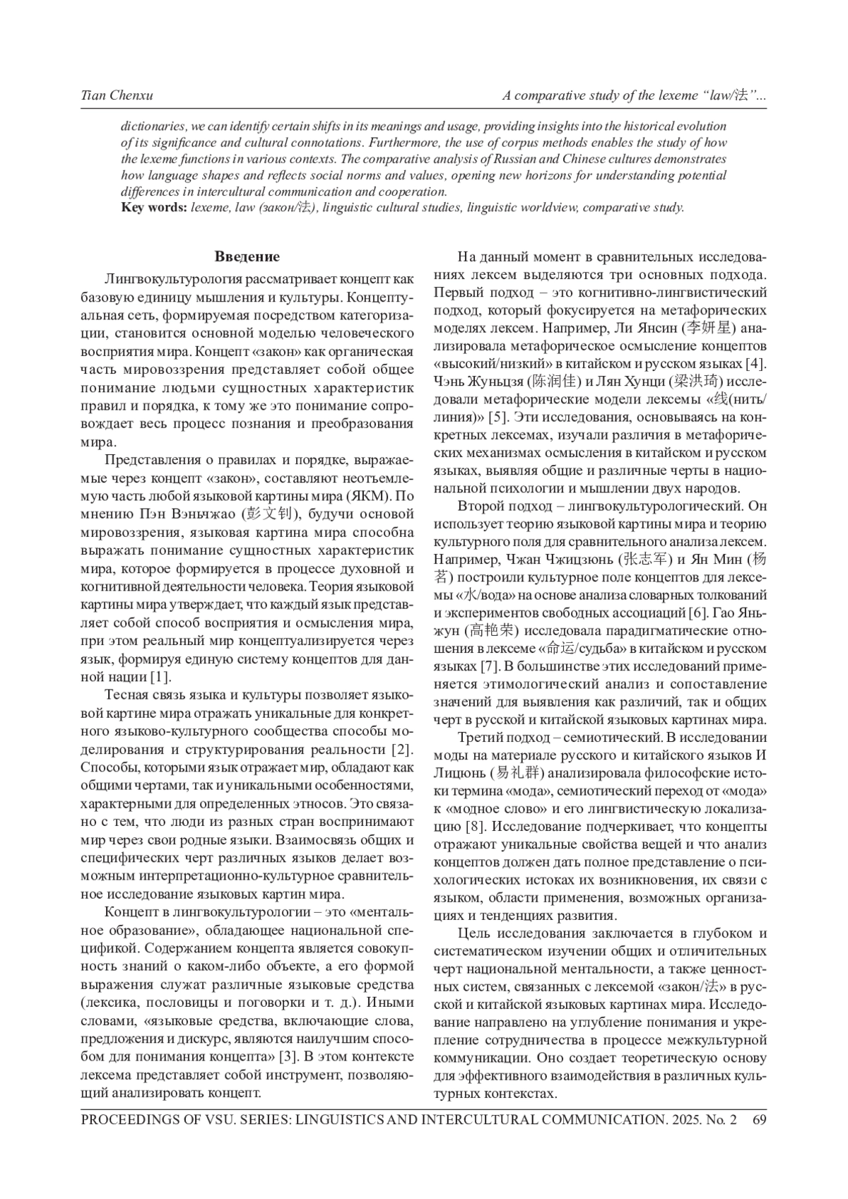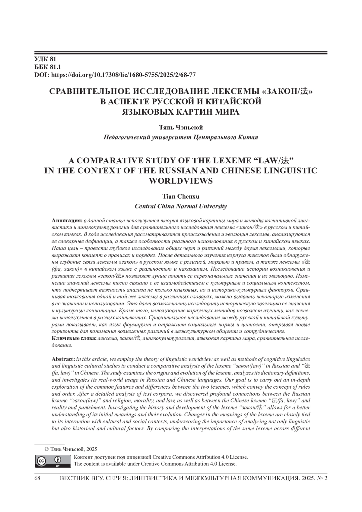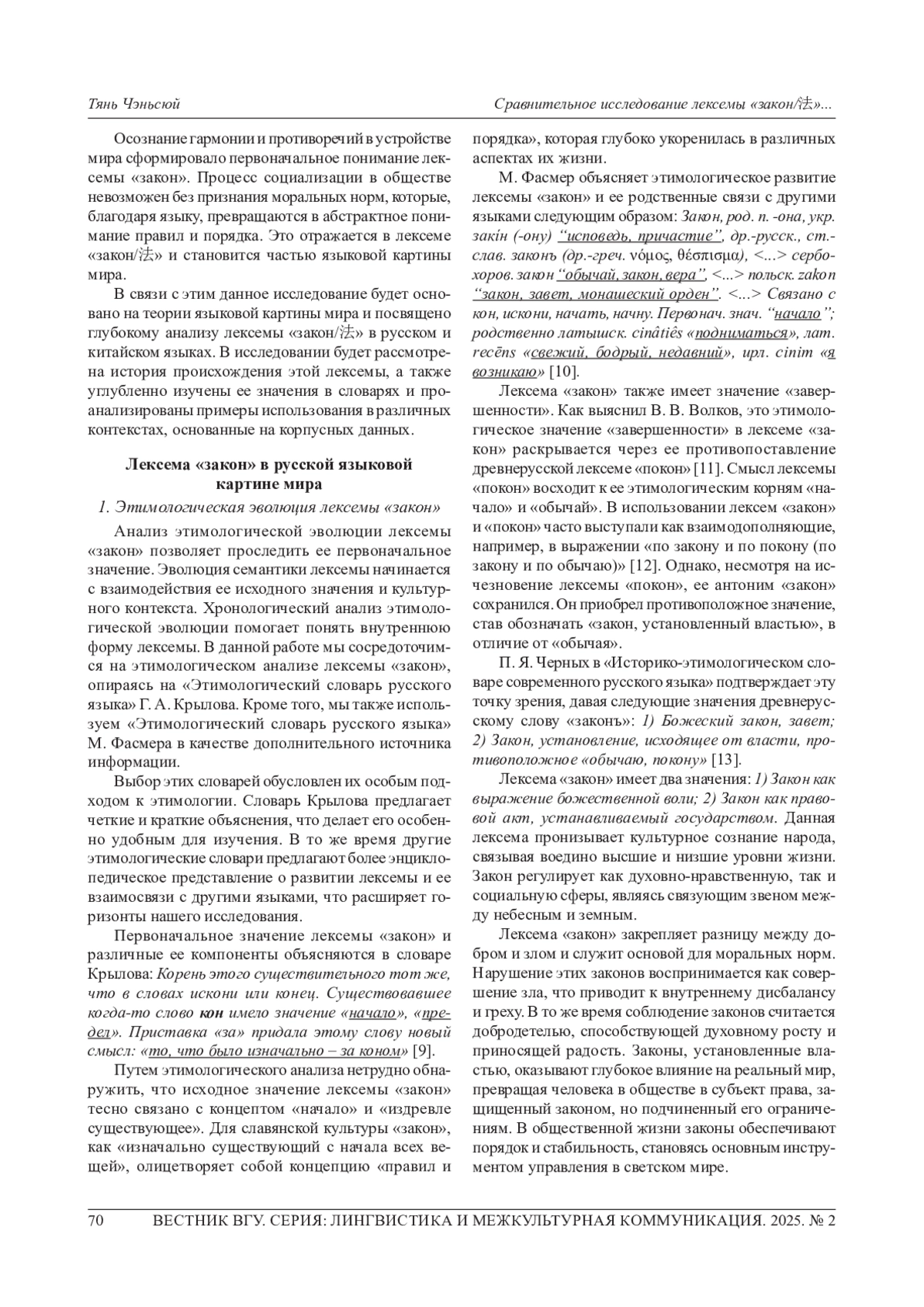 В данной статье используется теория языковой картины мира и методы когнитивной лингвистики и лингвокультурологии для сравнительного исследования лексемы «закон/Ш» в русском и китайском языках. В ходе исследования рассматриваются происхождение и эволюция лексемы, анализируются ее словарные дефиниции, а также особенности реального использования в русском и китайском языках. Наша цель - провести глубокое исследование общих черт и различий между двумя лексемами, которые выражают концепт о правилах и порядке. После детального изучения корпуса текстов были обнаружены глубокие связи лексемы «закон» в русском языке с религией, моралью и правом, а также лексемы «Ш (фа, закон)» в китайском языке с реальностью и наказанием. Исследование истории возникновения и развития лексемы «закон/Ш» позволяет лучше понять ее первоначальные значения и их эволюцию. Изменение значений лексемы тесно связано с ее взаимодействием с культурным и социальным контекстом, что подчеркивает важность анализа не только языковых, но и историко-культурных факторов. Сравнивая толкования одной и той же лексемы в различных словарях, можно выявить некоторые изменения в ее значении и использовании. Это дает возможность исследовать историческую эволюцию ее значения и культурные коннотации. Кроме того, использование корпусных методов позволяет изучить, как лексема используется в разных контекстах. Сравнительное исследование между русской и китайской культурами показывает, как язык формирует и отражает социальные нормы и ценности, открывая новые горизонты для понимания возможных различий в межкультурном общении и сотрудничестве.