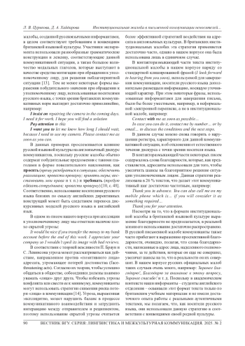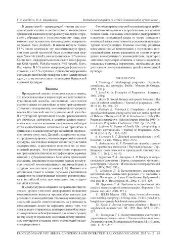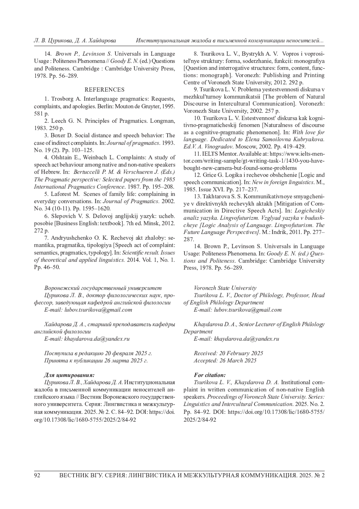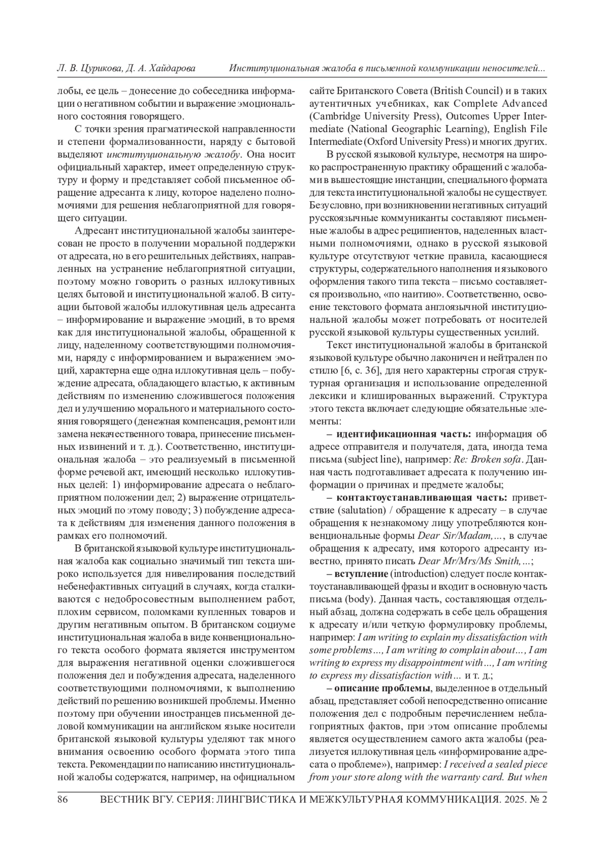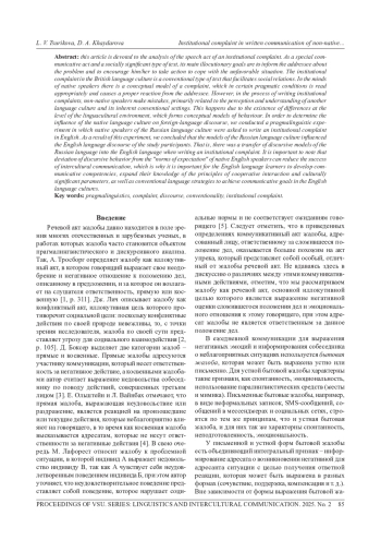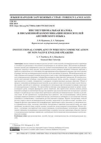 Данная статья посвящена анализу речевого акта жалобы институционального характера и способам его реализации в письменной коммуникации на английском языке. Письменная институциональная жалоба рассматривается нами как особый коммуникативный акт, осуществляемый в рамках социально значимого типа текста, иллокутивными целями которого являются сообщение адресату о проблеме и побуждение его к действиям для нивелирования неблагоприятной ситуации, при этом в разных культурах тексты институциональной жалобы могут выглядеть по-разному. Институциональная жалоба в британской языковой культуре реализуется в виде четко структурированного текста определенного конвенционального формата, который фасилитирует общественные отношения. В сознании носителей этой языковой культуры существует концептуальная модель жалобы, которая в определенных прагматических условиях считывается и вызывает соответствующую реакцию адресата. Однако в процессе написания институциональной жалобы на английском языке неносители языка часто допускают ошибки, прежде всего связанные с восприятием и пониманием другой языковой культуры и присущих ей конвенциональных установок. Так происходит вследствие существования различий на уровне лингвокультурной среды, которая формирует модели поведения. Для определения степени влияния родной языковой культуры на иноязычный дискурс был проведен прагмалингвистический эксперимент, в рамках которого носителям русского языка было предложено написать институциональную жалобу на английском языке. В ходе проведенного эксперимента было выявлено, что коммуникативные модели родной культуры напрямую влияют на инофонный дискурс участников исследования и их англоязычные тексты создаются в соответствии с конвенциями русской языковой культуры. Перенос дискурсивных моделей русского языка в текст институциональной жалобы, написанной на английском языке, наглядно иллюстрирует феномен прагматической интерференции, требующий особого внимания и в теоретическом, и в практическом плане, поскольку отклонение дискурсивного поведения неносителей языка от «норм ожидания» носителей языка может снизить успешность межкультурной коммуникации. Именно поэтому у изучающих иностранный язык важно развивать коммуникативные компетенции, расширять знания о принципах кооперативного взаимодействия, культурно значимых параметрах общения, а также о конвенциональных языковых стратегиях, необходимых для достижения коммуникативных целей в иноязычной культуре.
