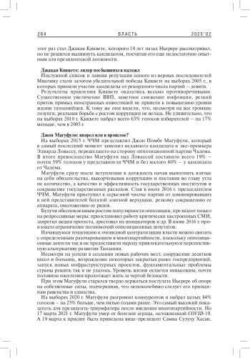 В 2025 г. Объединенную Республику Танзания ждут очередные президентские выборы - ровно 30 лет спустя после возвращения многопартийности в политическую реальность этой восточноафриканской страны. Какими были эти три десятилетия для ОРТ, правящей в ней партии ЧЧМ (Партия революции) в отсутствие их отца-основателя Джулиуса Камбараге Ньерере? Смогут ли его последователи продолжить победную серию на выборах главы государства? Преемники Мвалиму (Учитель - суахили), как его называют танзанийцы, кто в открытую, кто с оглядкой, взяли курс на реформирование созданного им партийно-государственного устройства общества. В статье рассматриваются формирование и генезис возникшего более 30 лет назад курса на перемены, роль многопартийности в этом процессе; особенности поведения партийно-политических элит при разных президентах «постньерерского» времени - от Бена Мкапы до «мамы» Самии. Описывая особенности правления наследников Ньерере на базе системно-исторических и теоретико-аналитических подходов, автор приходит к заключению, что Танзания сумела остаться едва ли не единственной африканской страной, которая и в новом тысячелетии в общем избежала политической турбулентности, сохранила исключительно конституционный механизм передачи власти и приверженность к главному завету Мвалиму - единству нации.