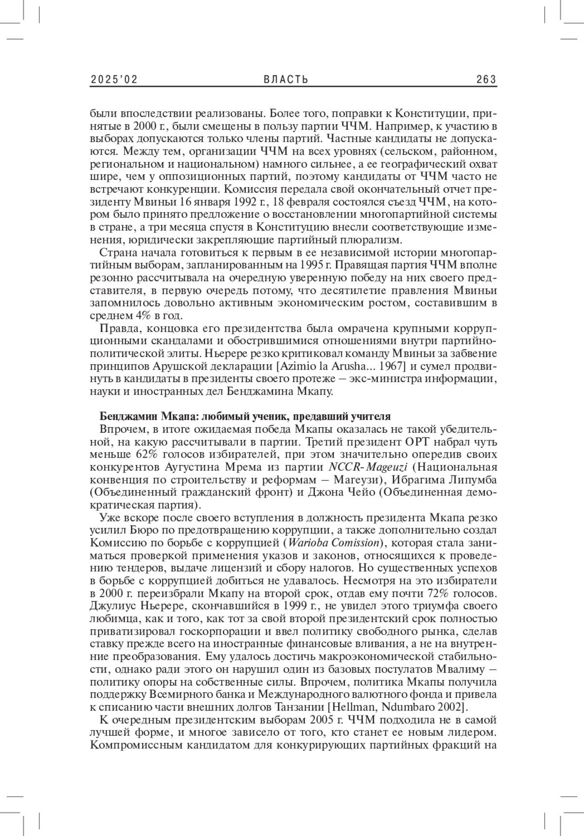 6. Hellman B., Ndumbaro L. 2002. Corruption, Politics, and Societal Values in Tanzania: An Evaluation of the Mkapa Administration’s Anti-Corruption Efforts. - African Journal of Political Sciences. Vol. 7. No. 1. P. 1-19.