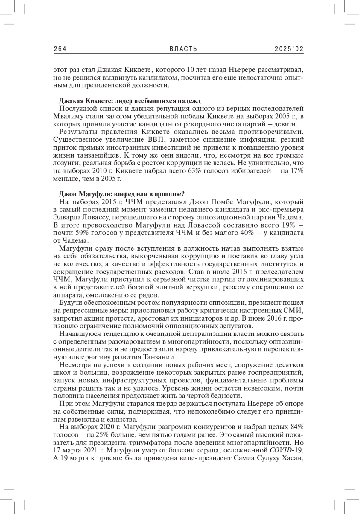 В отличие от Африки и Запада, основательно взявшихся за изучение явления многопартийности на континенте в целом и в Танзании в частности [Anyimadu 2016; Kelsall 2003; Mwinyi 2020; Nyaluke, Connolly 2013; Shaw 2016], в России пока издано не так много работ, посвященных этой теме и ее месту в современной африканской повестке.