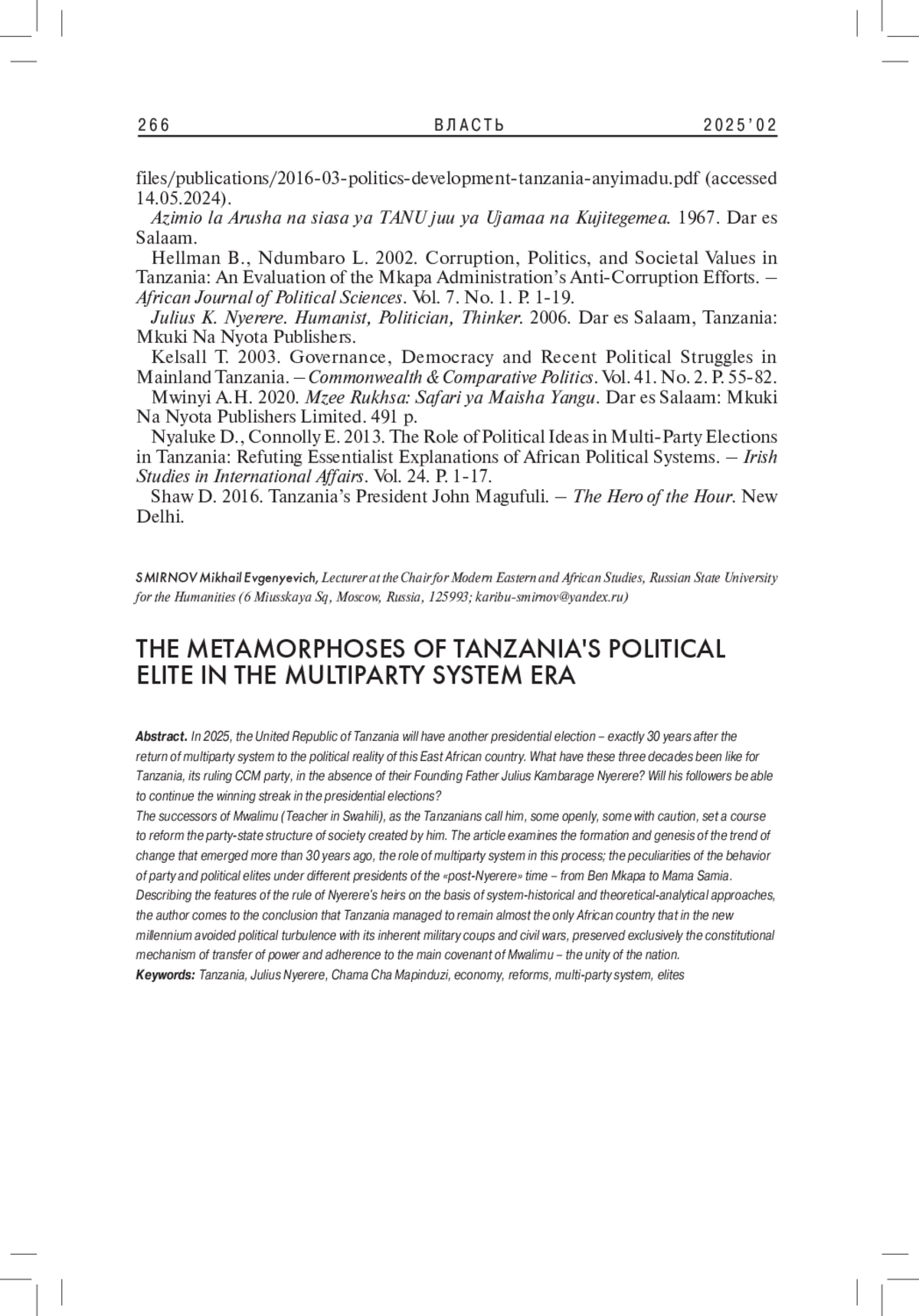 8. Kelsall T. 2003. Governance, Democracy and Recent Political Struggles in Mainland Tanzania. - Commonwealth & Comparative Politics. Vol. 41. No. 2. P. 55-82.