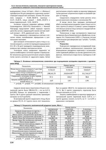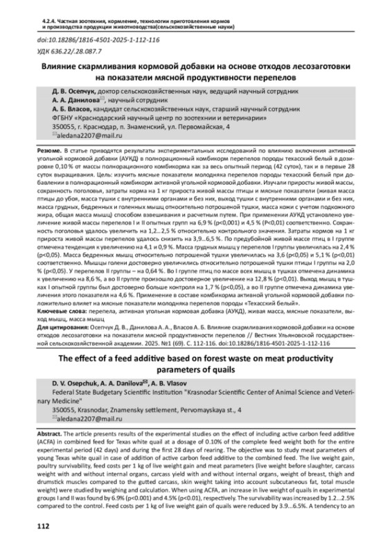Цель: изучить мясные показатели молодняка перепелов породы техасский белый при добавлении в полнорационный комбикорм активной угольной кормовой добавки. Изучали приросты живой массы, сохранность поголовья, затраты корма на 1 кг прироста живой массы птицы и мясные показатели (живая масса птицы до убоя, масса тушки с внутренними органами и без них, выход тушки с внутренними органами и без них, масса грудных, бедренных и голенных мышц относительно потрошеной тушки, масса кожи с учетом подкожного жира, общая масса мышц) способом взвешивания и расчетным путем. При применении АУКД установлено увеличение живой массы перепелов I и II опытных групп на 6,9 % (р<0,001) и 4,5 % (Р<0,01) соответственно. Сохранность поголовья удалось увеличить на 1,2…2,5 % относительно контрольного значения. Затраты кормов на 1 кг прироста живой массы перепелов удалось снизить на 3,9…6,5 %. По предубойной живой массе птиц в I группе отмечена тенденция к увеличению на 4,1 и 0,9 %. Масса грудных мышц у перепелов I группы увеличилась на 2,4 % (р<0,05). Масса бедренных мышц относительно потрошеной тушки увеличилась на 3,6 (р<0,05) и 5,1 % (р<0,01) соответственно. Мышцы голени достоверно увеличились относительно потрошеной тушки птицы I группы на 2,0 % (р<0,05). У перепелов II группы - на 0,64 %. Во I группе птиц по массе всех мышц в тушках отмечена динамика к увеличению на 8,6 %, а во II группе произошло достоверное увеличение на 12,8 % (р<0,01). Выход мышц в тушках I опытной группы был достоверно больше контроля на 1,7 % (р<0,05), а во II группе отмечена динамика увеличения этого показателя на 4,6 %. Применение в составе комбикорма активной угольной кормовой добавки положительно влияет на мясные показатели молодняка перепелов породы «Техасский белый».