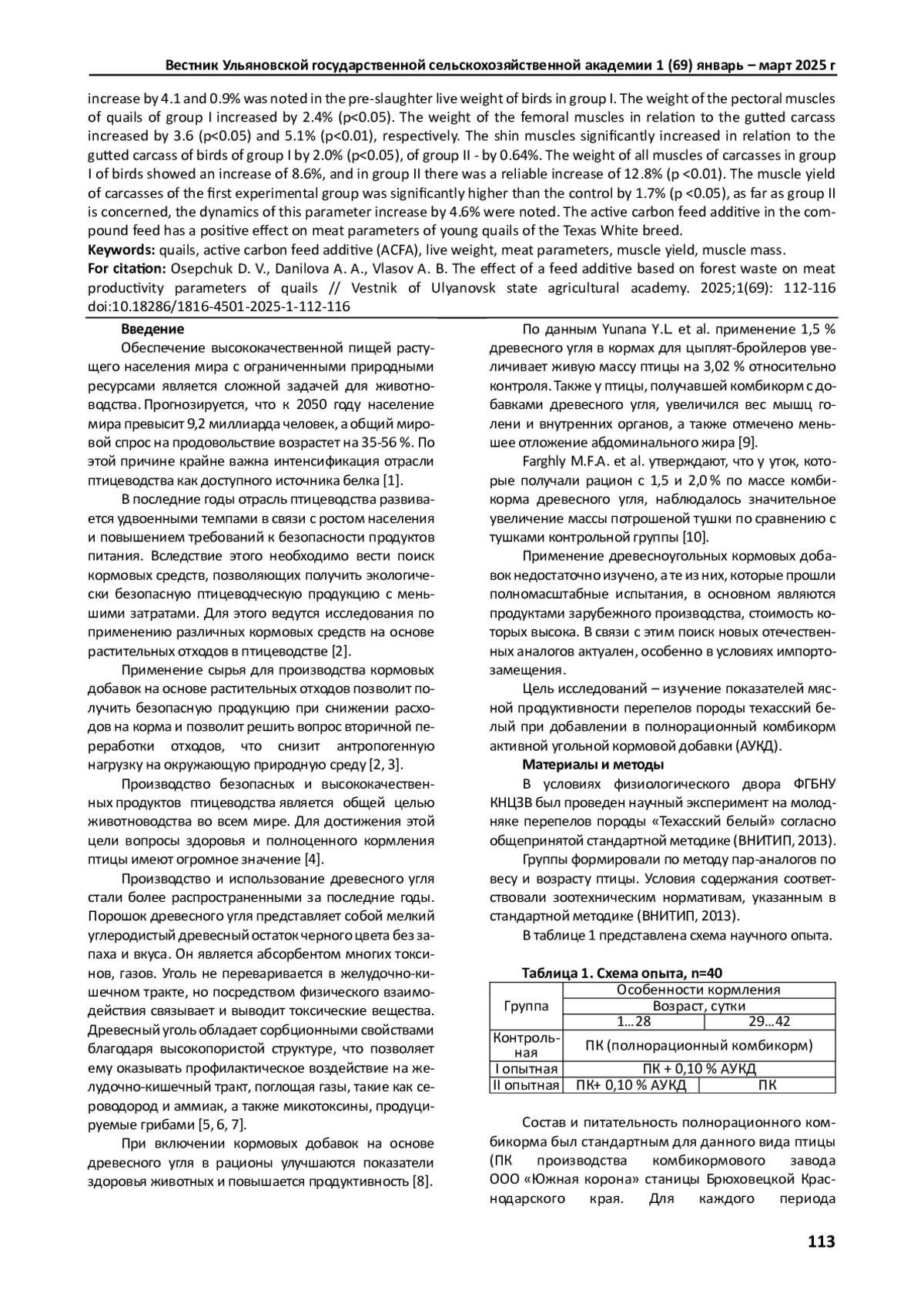 В статье приводятся результаты экспериментальных исследований по влиянию включения активной угольной кормовой добавки (АУКД) в полнорационный комбикорм перепелов породы техасский белый в дозировке 0,10 % от массы полнорационного комбикорма как за весь опытный период (42 суток), так и в первые 28 суток выращивания.