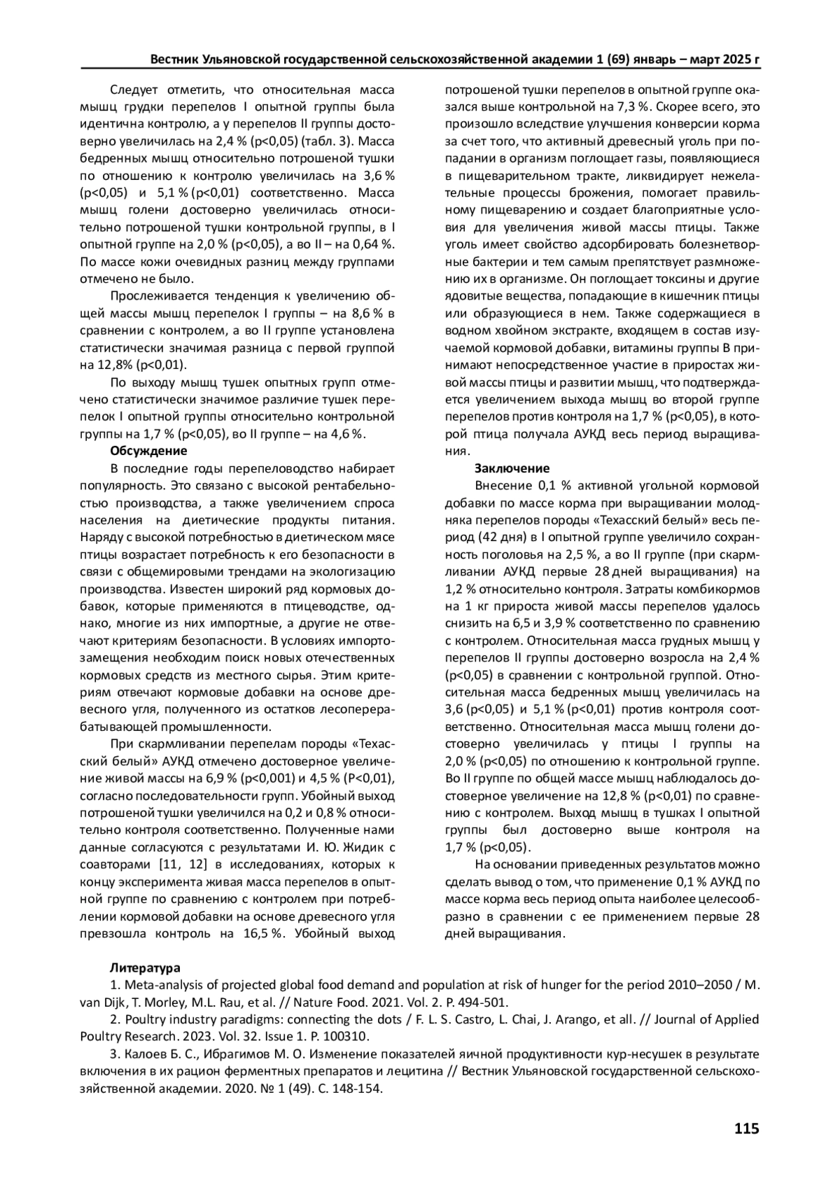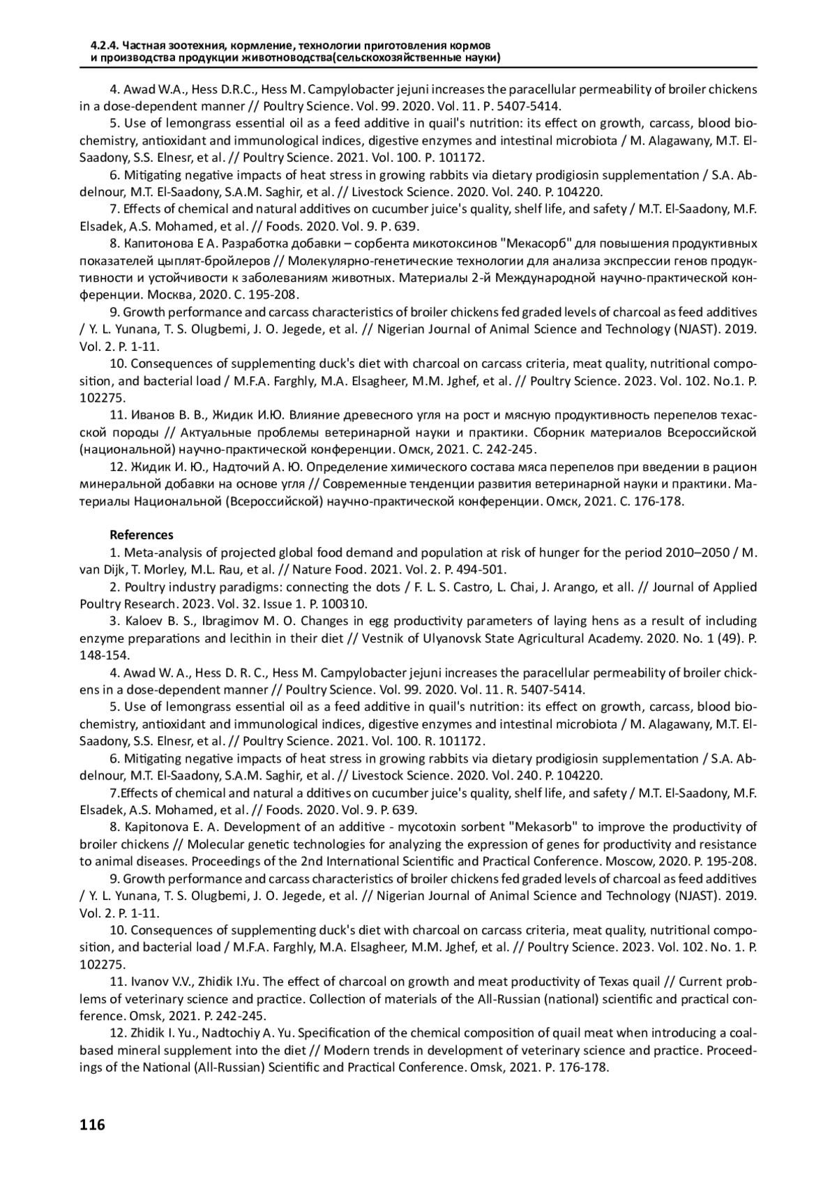 11. Иванов В. В., Жидик И.Ю. Влияние древесного угля на рост и мясную продуктивность перепелов техасской породы // Актуальные проблемы ветеринарной науки и практики. Сборник материалов Всероссийской (национальной) научно-практической конференции. Омск, 2021. С. 242-245. EDN: WITYNR