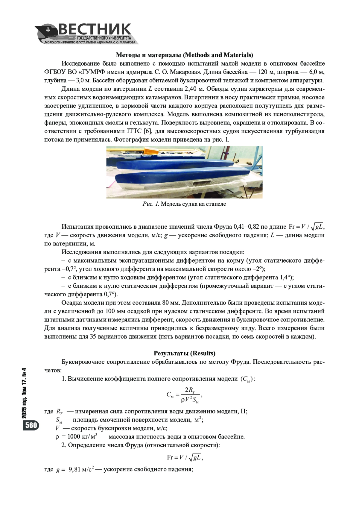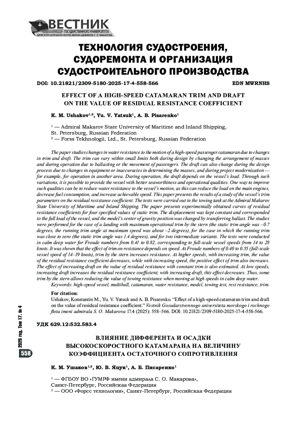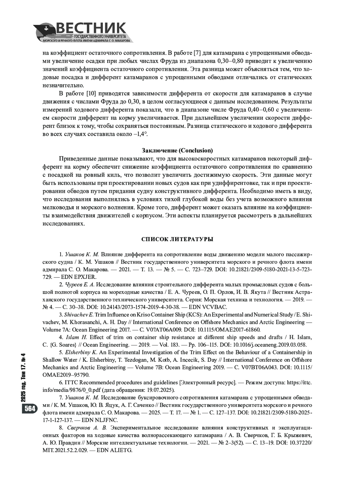 7. Ушаков К. М. Исследование буксировочного сопротивления катамарана с упрощенными обводами / К. М. Ушаков, Ю. В. Яцук, А. Г. Саченко // Вестник государственного университета морского и речного флота имени адмирала С. О. Макарова. - 2025. - Т. 17. - № 1. - С. 127-137. https://doi.org/10.21821/2309-5180-202517-1-127-137. - EDN NLJFNC.