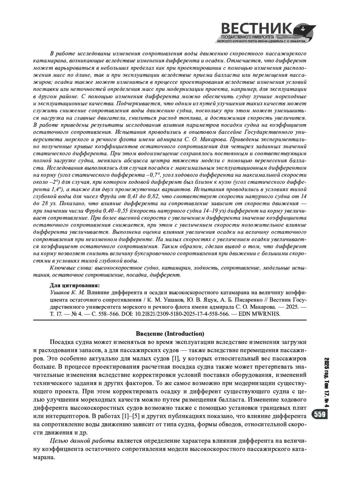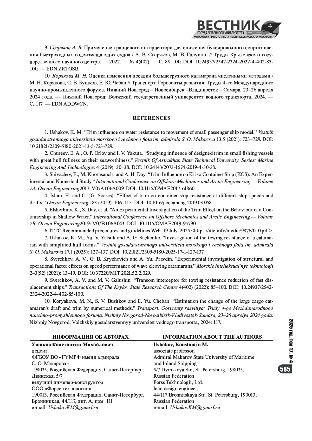1. Ушаков К. М. Влияние дифферента на сопротивление воды движению модели малого пассажирского судна / К. М. Ушаков // Вестник государственного университета морского и речного флота имени адмирала С. О. Макарова. - 2021. - Т. 13. - № 5. - С. 723-729. https://doi.org/10.21821/2309-5180-2021-13-5-723729. - EDN EPXJER.