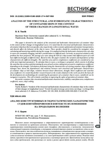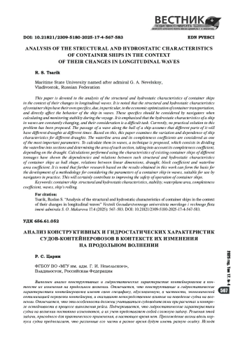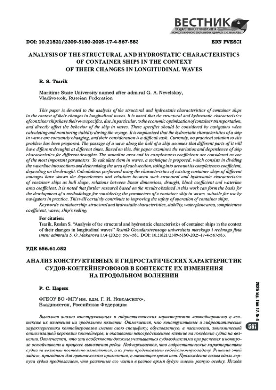Выполнен анализ конструктивных и гидростатических характеристик контейнеровозов в контексте их изменения на продольном волнении. Отмечается, что конструктивные и гидростатические характеристики контейнеровозов имеют свою специфику, обусловленную, в частности, экономической оптимизацией перевозки контейнеров, и оказывают непосредственное влияние на поведение судна на волнении. Отмечается, что эти особенности должны учитываться судоводителями при расчетах и контроле остойчивости в процессе выполнения рейса. Подчеркивается, что гидростатические характеристики судна на волнении постоянно изменяются, а их учет представляет собой сложную задачу. Решения этой задачи, пригодного для практического применения, в настоящее время нет. Прохождение волны вдоль корпуса судна предполагает, что различные его части в разное время будут иметь разную осадку. Исходя из этого в настоящей работе исследуется изменение и зависимость характеристик судна для разных осадок. В качестве важнейших параметров рассмотрена площадь ватерлинии и коэффициенты ее полноты. Для их расчета на волнении предложена методика, которая заключается в разбиении ватерлинии на секции и определении площади каждой из них с учетом ее коэффициента полноты, зависящего от осадки. Расчеты, выполненные с использованием характеристик действующих контейнеровозов разного тоннажа, показали зависимости и соотношения между такими конструктивными и гидростатическими характеристиками контейнеровозов, как обводы корпуса, соотношения линейных характеристик, осадка, коэффициент общей полноты и коэффициент полноты площади ватерлинии. Отмечается, что дальнейшие исследования на основе полученных в настоящей работе результатов, могут могут служить основой разработки методики учета параметров контейнеровоза на волнении, пригодной для применения судоводителями на практике, что, безусловно, будет способствовать повышению безопасности эксплуатации судов-контейнеровозов.