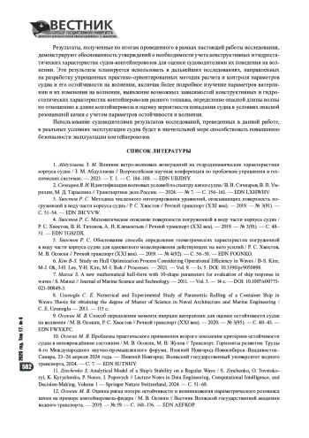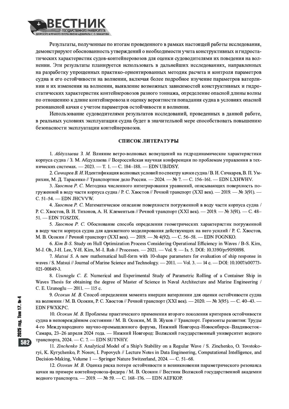 12. Осокин М. В. Оценка риска потери остойчивости и возникновения параметрического резонанса качки на примере контейнеровоза-фидера / М. В. Осокин // Вестник Волжской государственной академии водного транспорта. - 2019. - № 59. - С. 168-176. - EDN AEFKOP.