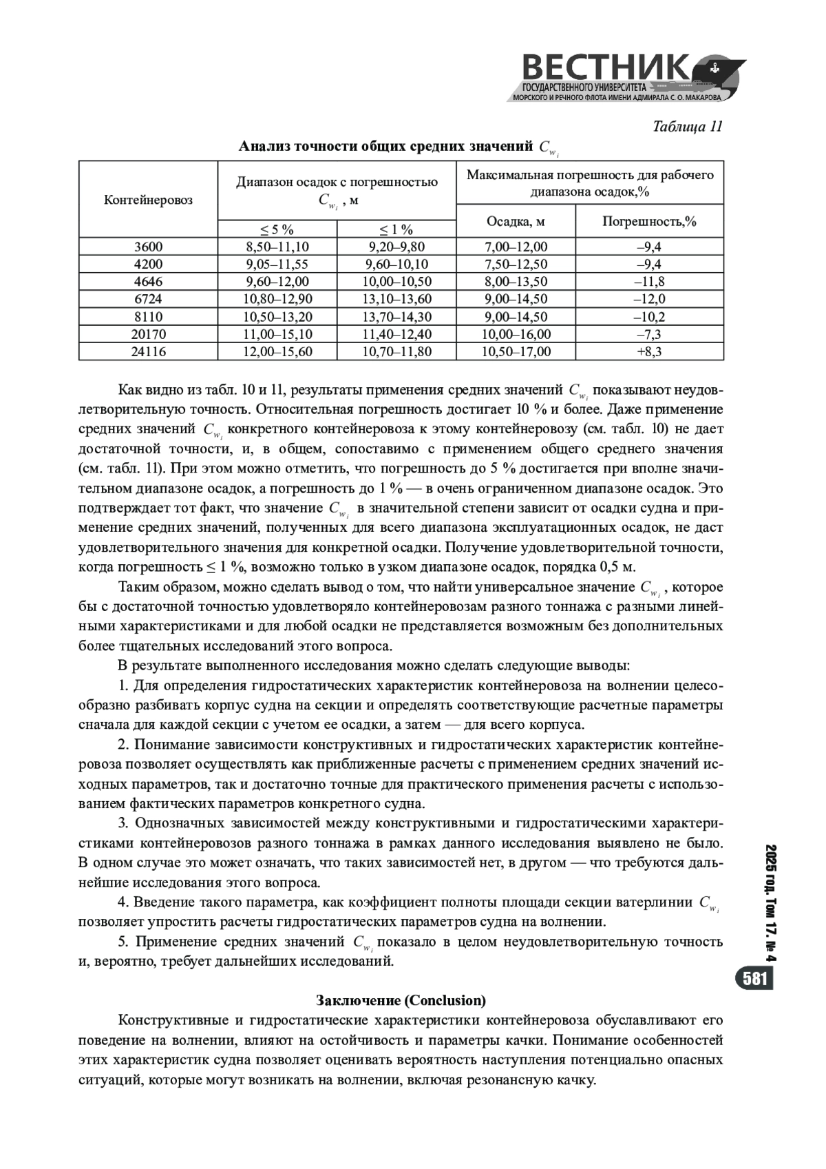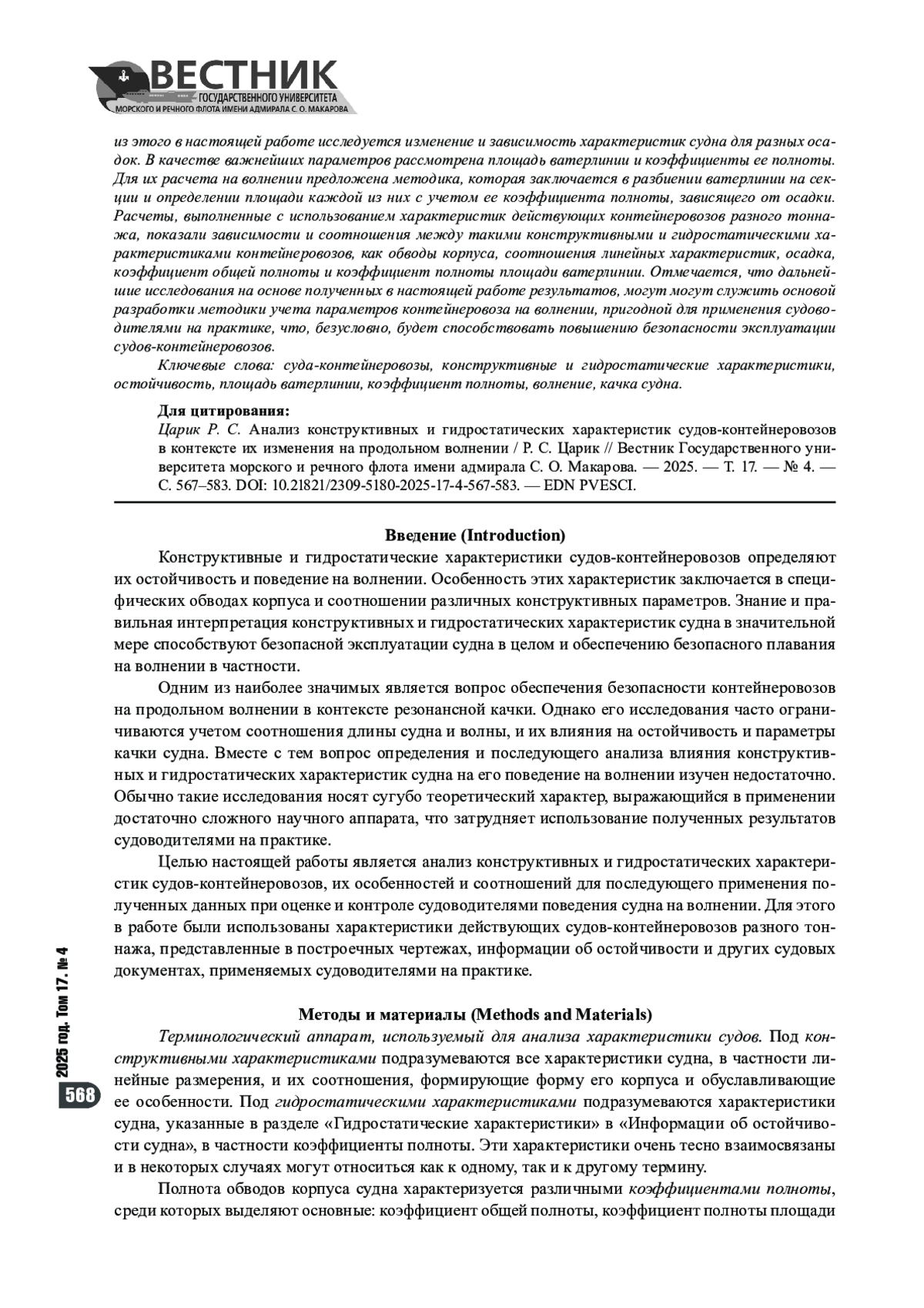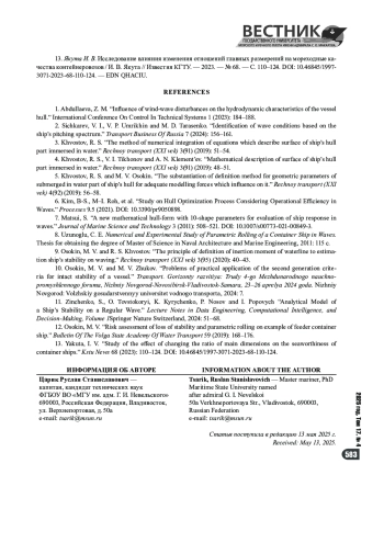 13. Якута И. В. Исследование влияния изменения отношений главных размерений на мореходные качества контейнеровозов / И. В. Якута // Известия КГТУ. - 2023. - № 68. - С. 110-124. https://doi.org/10.46845/19973071-2023-68-110-124. - EDN QHACIU.