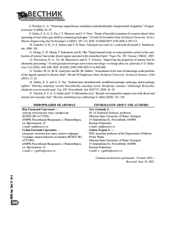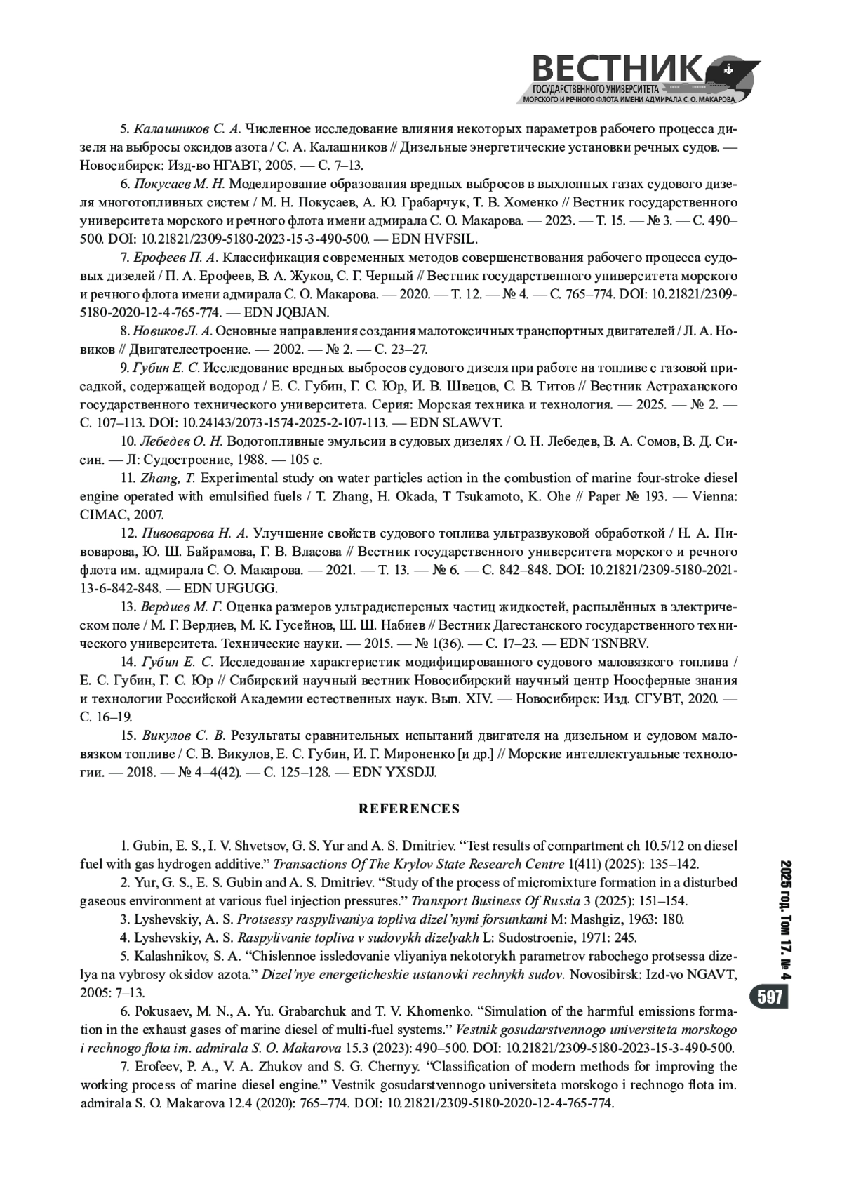 9. Губин Е. С. Исследование вредных выбросов судового дизеля при работе на топливе с газовой присадкой, содержащей водород / Е. С. Губин, Г. С. Юр, И. В. Швецов, С. В. Титов // Вестник Астраханского государственного технического университета. Серия: Морская техника и технология. - 2025. - № 2. - С. 107-113. https://doi.org/10.24143/2073-1574-2025-2-107-113. - EDN SLAWVT.