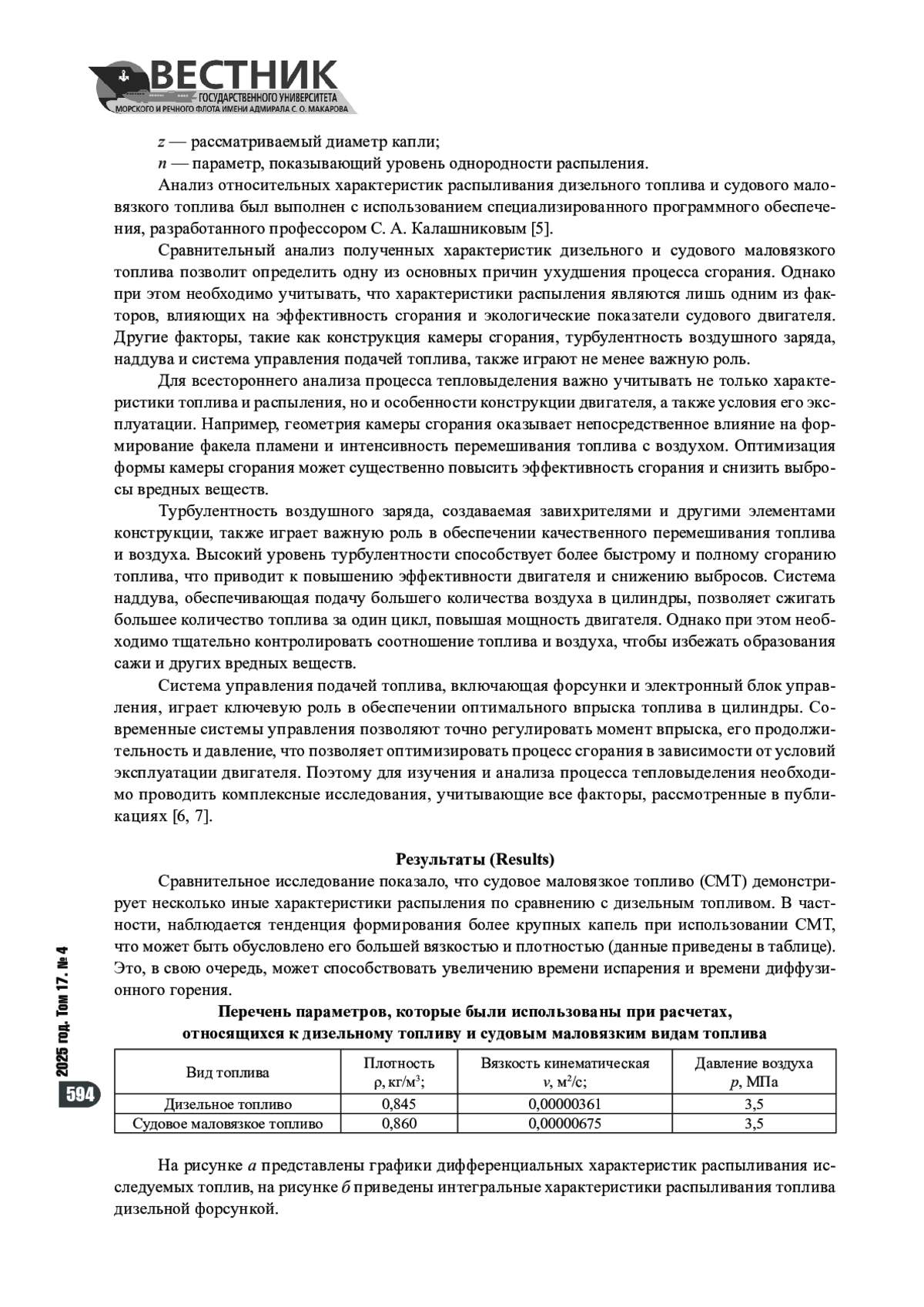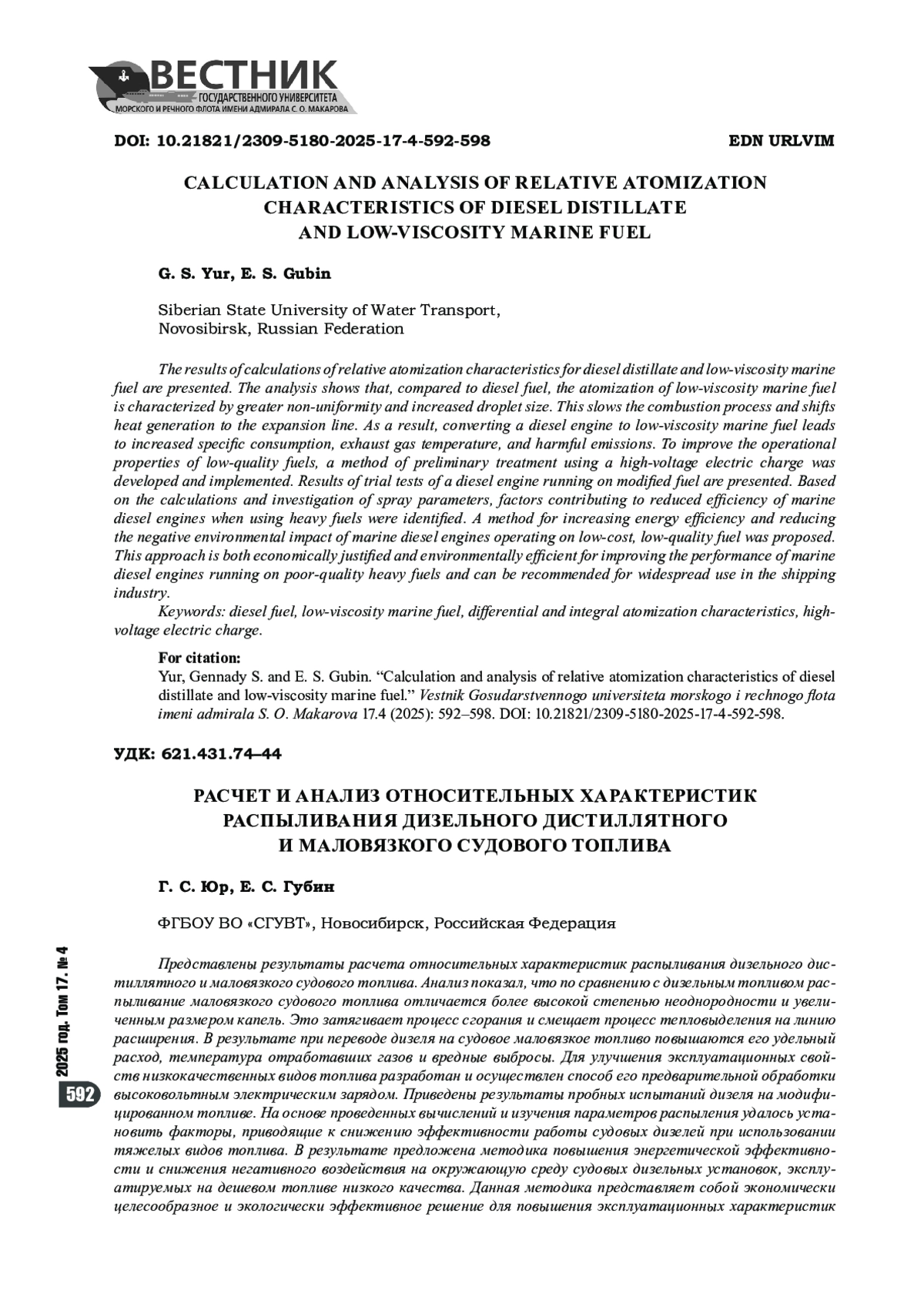 Представлены результаты расчета относительных характеристик распыливания дизельного дистиллятного и маловязкого судового топлива. Анализ показал, что по сравнению с дизельным топливом распыливание маловязкого судового топлива отличается более высокой степенью неоднородности и увеличенным размером капель. Это затягивает процесс сгорания и смещает процесс тепловыделения на линию расширения. В результате при переводе дизеля на судовое маловязкое топливо повышаются его удельный расход, температура отработавших газов и вредные выбросы. Для улучшения эксплуатационных свойств низкокачественных видов топлива разработан и осуществлен способ его предварительной обработки высоковольтным электрическим зарядом. Приведены результаты пробных испытаний дизеля на модифицированном топливе. На основе проведенных вычислений и изучения параметров распыления удалось установить факторы, приводящие к снижению эффективности работы судовых дизелей при использовании тяжелых видов топлива. В результате предложена методика повышения энергетической эффективности и снижения негативного воздействия на окружающую среду судовых дизельных установок, эксплуатируемых на дешевом топливе низкого качества. Данная методика представляет собой экономически целесообразное и экологически эффективное решение для повышения эксплуатационных характеристик судовых дизельных установок, работающих на тяжелых видах топлива низкого качества, и может быть рекомендована для широкого применения в судоходной отрасли.