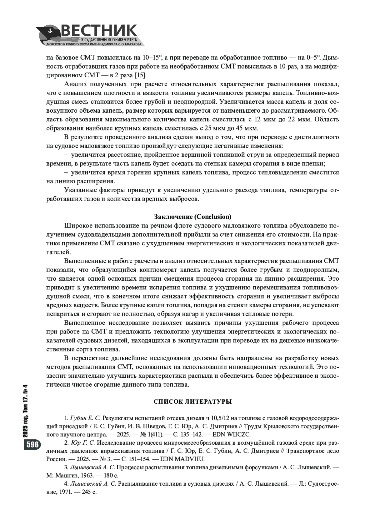 1. Губин Е. С. Результаты испытаний отсека дизеля ч 10,5/12 на топливе с газовой водородосодержащей присадкой / Е. С. Губин, И. В. Швецов, Г. С. Юр, А. С. Дмитриев // Труды Крыловского государственного научного центра. - 2025. - № 1(411). - С. 135-142. - EDN WIICZC.