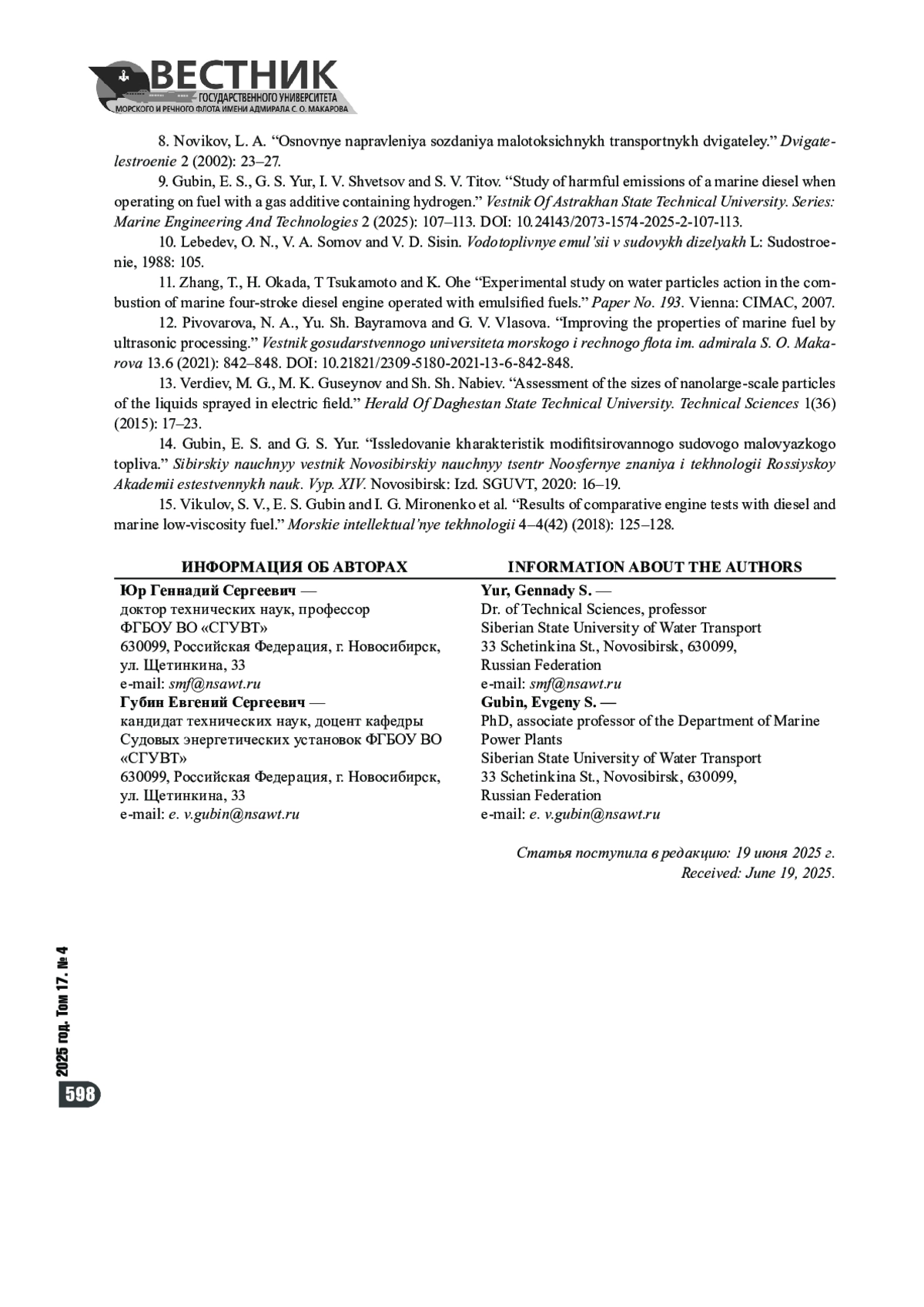14. Губин Е. С. Исследование характеристик модифицированного судового маловязкого топлива / Е. С. Губин, Г. С. Юр // Сибирский научный вестник Новосибирский научный центр Ноосферные знания и технологии Российской Академии естественных наук. Вып. XIV. - Новосибирск: Изд. СГУВТ, 2020. - С. 16-19.