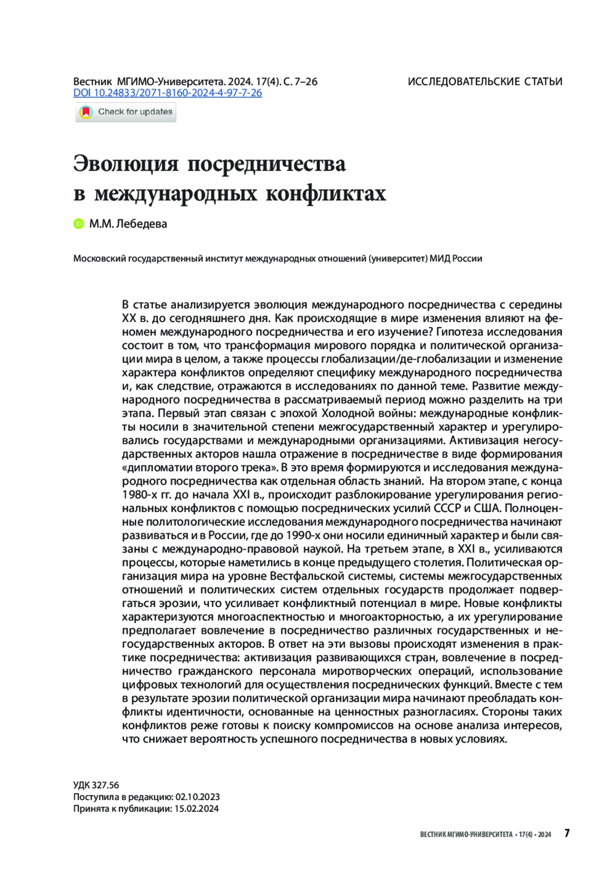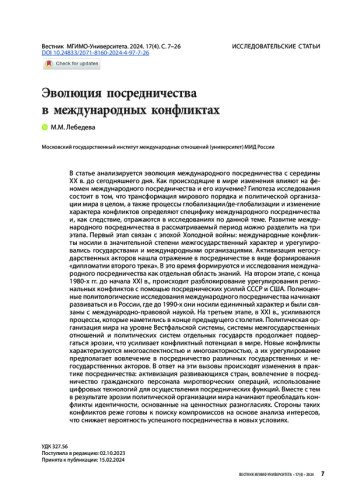В статье анализируется эволюция международного посредничества с середины XX века до сегодняшнего дня. Как происходящие в мире изменения влияют на феномен международного посредничества и его изучение? Гипотеза исследования состоит в том, что трансформация мирового порядка и политической организации мира в целом, а также процессы глобализации/де-глобализации и изменение характера конфликтов определяют специфику международного посредничества и, как следствие, отражаются в исследованиях по данной теме. Развитие международного посредничества в рассматриваемый период можно разделить на три этапа. Первый этап связан с эпохой холодной войны: международные конфликты носили в значительной степени межгосударственный характер и урегулировались государствами и международными организациями. Активизация негосударственных акторов нашла отражение в посредничестве в виде формирования «дипломатии второго трека». В это время формируются и исследования международного посредничества как отдельная область знаний. На втором этапе, с конца 1980-х годов до начала ХХI века, происходит разблокирование урегулирования региональных конфликтов с помощью посреднических усилий СССР и США. Полноценные политологические исследования международного посредничества начинают развиваться и в России, где до 1990-х они носили единичный характер и были связаны с международно-правовой наукой. На третьем этапе, в XXI веке, усиливаются процессы, которые наметились в конце предыдущего столетия. Политическая организация мира на уровне Вестфальской системы, системы межгосударственных отношений и политических систем отдельных государств продолжает подвергаться эрозии, что усиливает конфликтный потенциал в мире. Новые конфликты характеризуются многоаспектностью и многоакторностью, а их урегулирование предполагает вовлечение в посредничество различных государственных и негосударственных акторов. В ответ на эти вызовы происходят изменения в практике посредничества: активизация развивающихся стран, вовлечение в посредничество гражданского персонала миротворческих операций, использование цифровых технологий для осуществления посреднических функций. Вместе с тем, в результате эрозии политической организации мира начинают преобладать конфликты идентичности, основанные на ценностных разногласиях. Стороны таких конфликтов реже готовы к поиску компромиссов на основе анализа интересов, что снижает вероятность успешного посредничества в новых условиях.