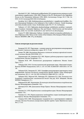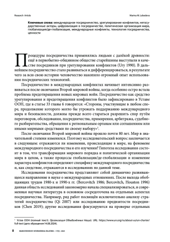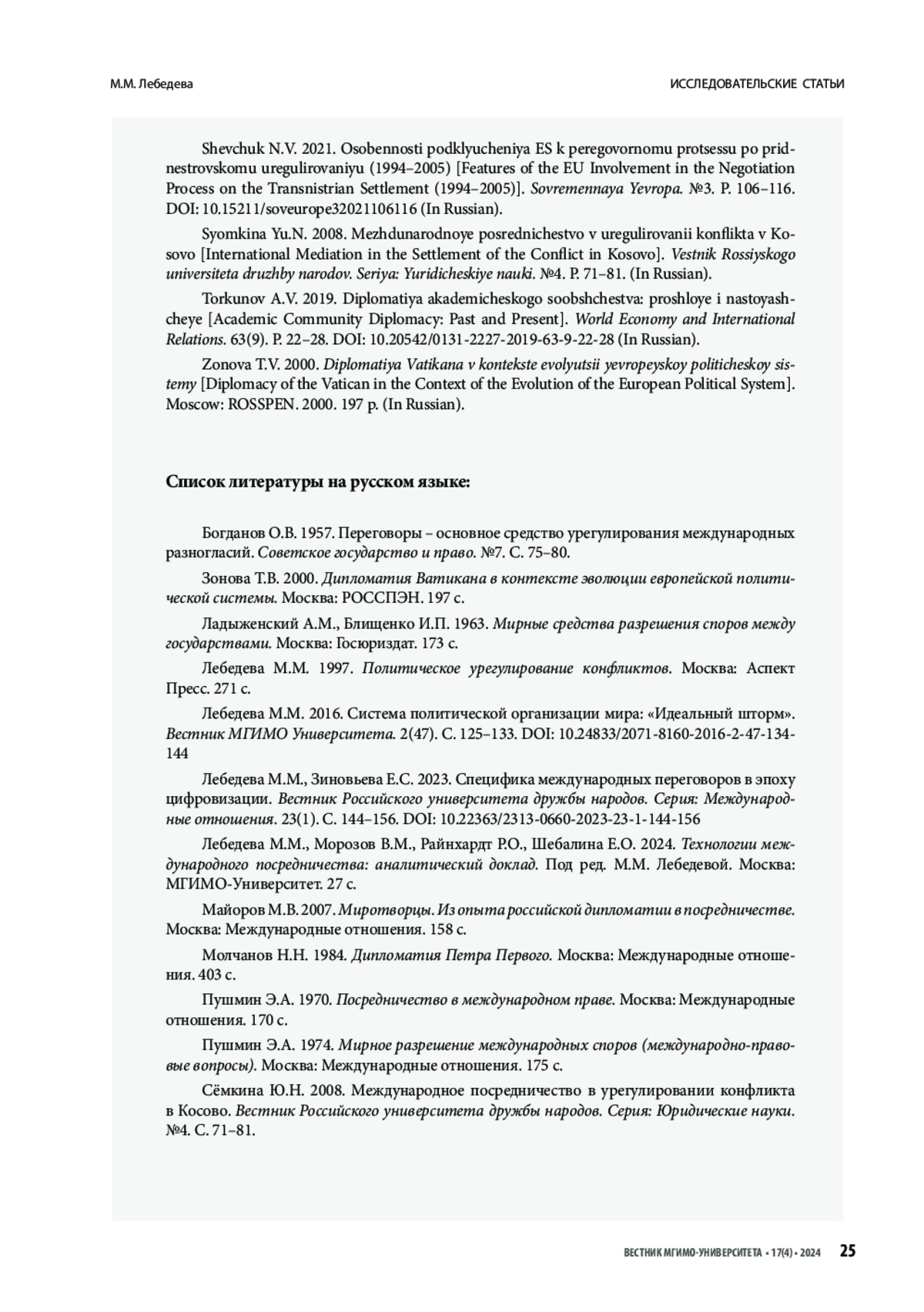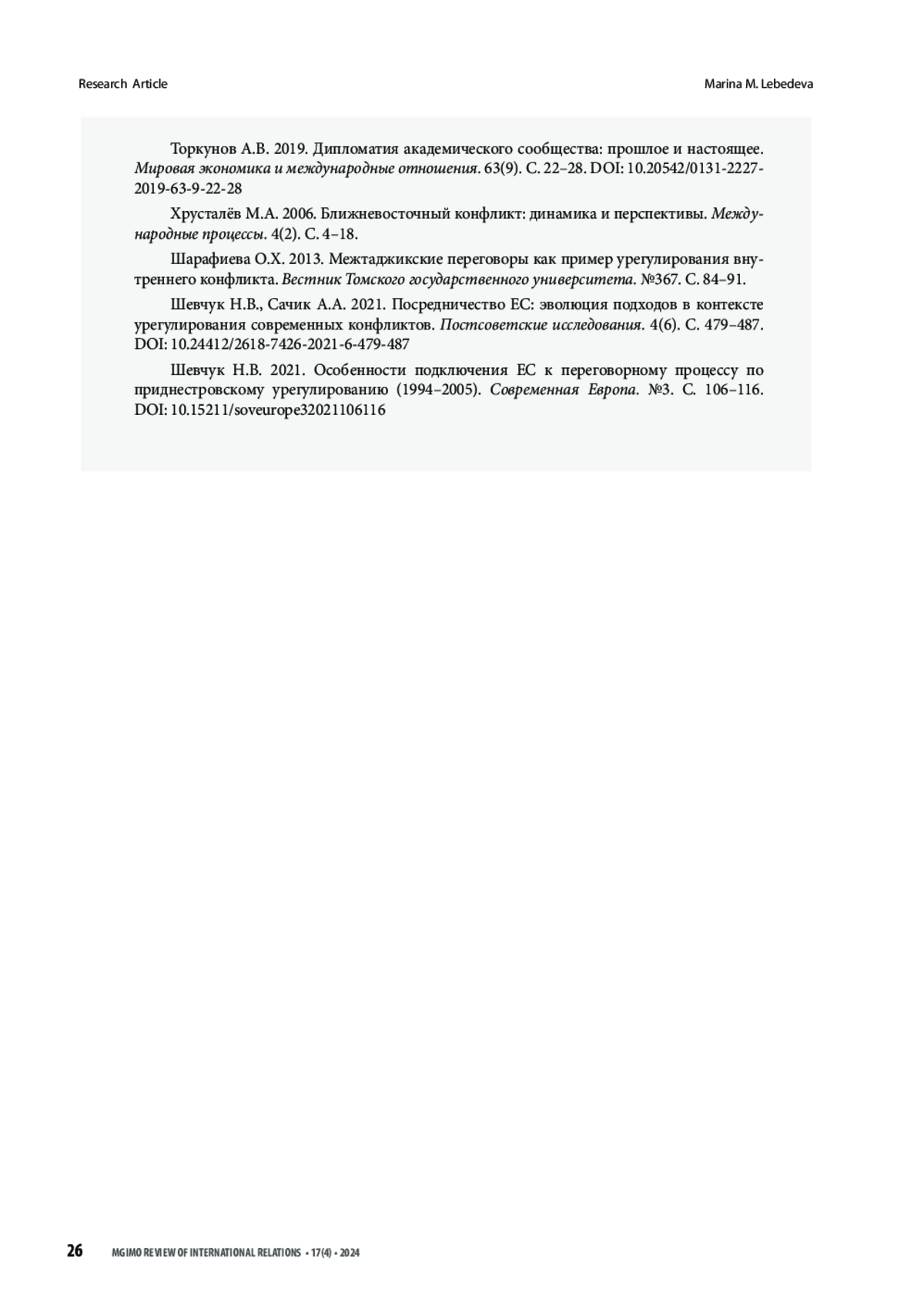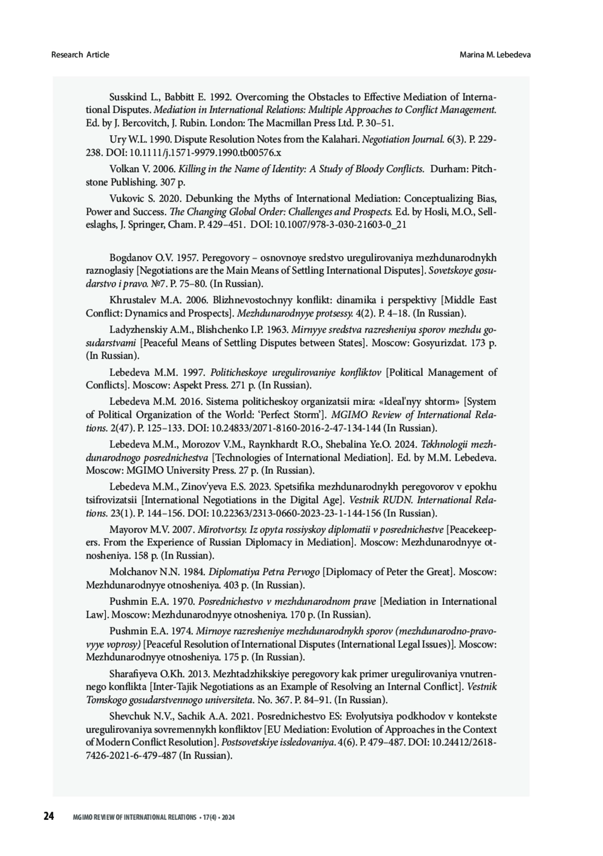 44. Лебедева М.М., Морозов В.М., Райнхардт Р.О., Шебалина Е.О. 2024. Технологии международного посредничества: аналитический доклад. Под ред. М.М. Лебедевой. М.: МГИМОУниверситет. 27 с.