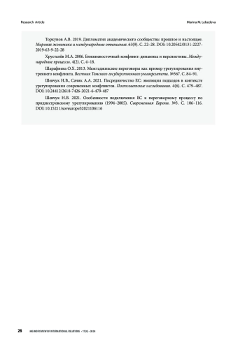 53. Шевчук Н.В., Сачик А.А. 2021. Посредничество ЕС: эволюция подходов в контексте урегулирования современных конфликтов. Постсоветские исследования. 4(6). С. 479-487. https://doi.org/10.24412/2618-7426-2021-6-479-487