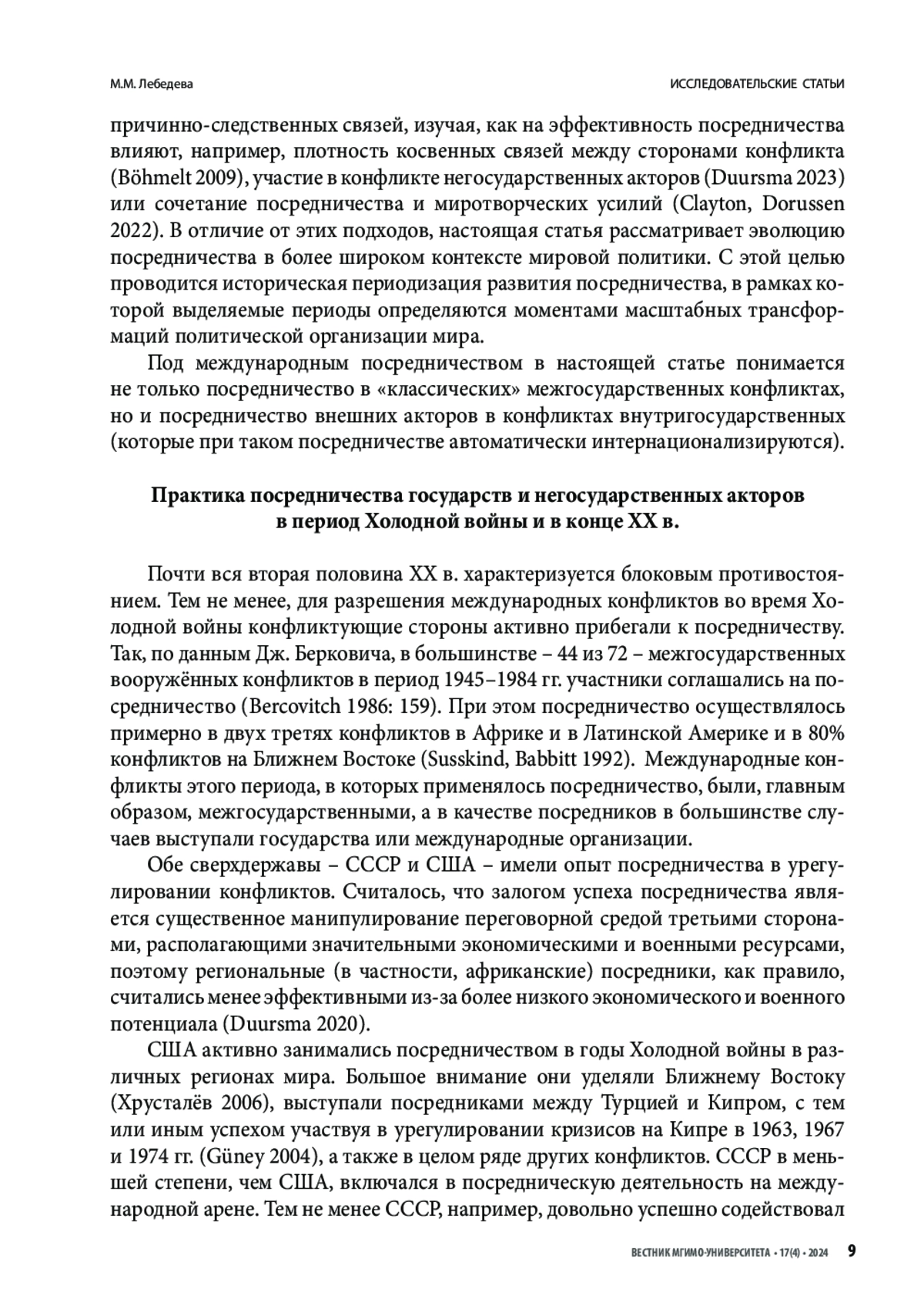 16. Duursma A. 2023. Peacekeeping, Mediation, and the Conclusion of Local Ceasefires in Non-State Conflicts. Journal of Conflict Resolution. 67(7-8). P. 1405-1429. https://doi.org/10.1177/00220027221148132