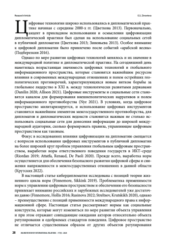 Методологически статья построена на теории жизненного цикла норм. Согласно данному подходу нормы представляют собой социальные стандарты, регулирующие поведение государств в определенной области международных отношений. Была исследована эволюция дискурса о нормах, регулирующих цифровую дипломатию и глобальное цифровое пространство. В настоящее время, произошёл отказ продвигаемых США норм глобального интернета, свободного от государственных границ. Сформировался набор норм в области ответственного поведения государств в ИКТ-среде, закреплённых в документах ООН, региональных организаций и иных международных форумов. Однако, направления их развития и практического применения остаются предметом межгосударственных дискуссии, ввиду высокой значимости данной проблемы и различий в интересах и подходах государств.