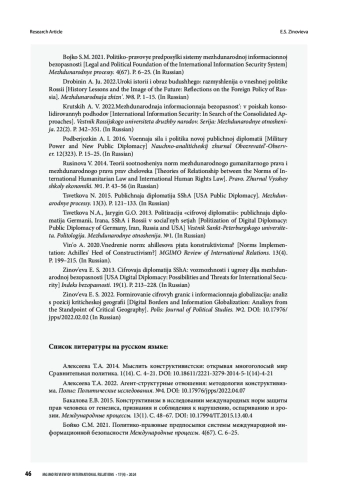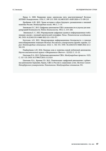 7. Зиновьева Е. С. 2013. Цифровая дипломатия США: возможности и угрозы для международной безопасности. Индекс безопасности. Т. 19. No. 1. С. 213-228.