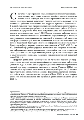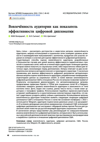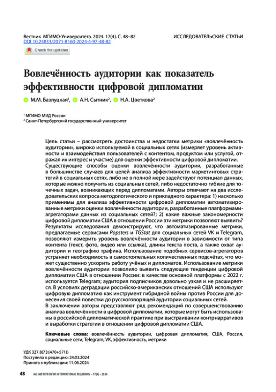 Цель статьи – рассмотреть достоинства и недостатки метрики «вовлеченности аудитории», широко используемой в социальных сетях (измеряет уровень активности и взаимодействия пользователей с контентом, продуктом или услугой, отражая их интерес и участие), для оценки эффективности цифровой дипломатии. Существующие способы оценки вовлеченности аудитории, разработанные в большинстве случаев для целей анализа эффективности маркетинговых стратегий в социальных сетях, либо не в полной мере задействуют потенциал данных, которые можно получить из социальных сетей, либо недостаточно гибкие для точечных задач, возникающих перед дипломатами. Авторы отвечают на два исследовательских вопроса методологического и прикладного характера: 1) насколько применимы для анализа эффективности цифровой дипломатии автоматизированные метрики оценки вовлеченности аудитории, разработанные платформами-агрегаторами данных из социальных сетей?; 2) какие важные закономерности цифровой дипломатии США в отношении России эти метрики позволяют выявить? Результаты исследования демонстрируют, что автоматизированные метрики, предлагаемые сервисами Popsters и TGStat для социальных сетей VK и Telegram, позволяют измерить уровень вовлеченности аудитории в зависимости от типа контента (текст, фото, видео или ссылка), длины текста поста, а также охват аудитории и географию трафика. Использование подобных сервисов-агрегаторов устраняет необходимость в самостоятельных количественных подсчётах, что может существенно ускорить работу учёных и дипломатов. Использование метрики вовлеченности аудитории позволило выявить следующие тенденции цифровой дипломатии США в отношении России: в качестве основной платформы с 2022 года используется Telegram; аудитория подписчиков довольно узкая и не расширяется. В условиях деградации российско-американских отношений США использует цифровую дипломатию как инструмент «гибридной войны» против России для донесения своей повестки до русскоговорящей аудитории социальных сетей. В заключении авторы представляют ряд рекомендаций по совершенствованию анализа вовлеченности в цифровой дипломатии, которые могут быть использованы в российской дипломатической практике при выстраивании контрнарративов и выработки стратегии в отношении цифровой дипломатии США.