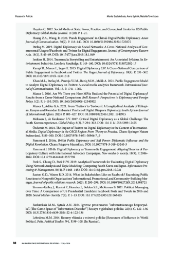 13. Manor I., Adiku G.A. 2021. From ‘traitors’ to ‘saviours’: A longitudinal analysis of Ethiopian, Kenyan and Rwandan embassies’ practice of digital diaspora diplomacy. South African Journal of International Affairs. 28(3). P. 403-427. https://doi.org/10.1080/10220461.2021.1948915
