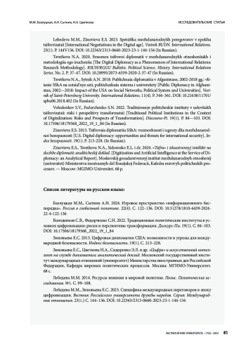 26. Лебедева М.М., Зиновьева Е.С. 2023. Специфика международных переговоров в эпоху цифровизации. Вестник Российского университета дружбы народов. Серия: Международные отношения. 23(1.) С. 144-156. https://doi.org/10.22363/2313-0660-2023-23-1-144-156