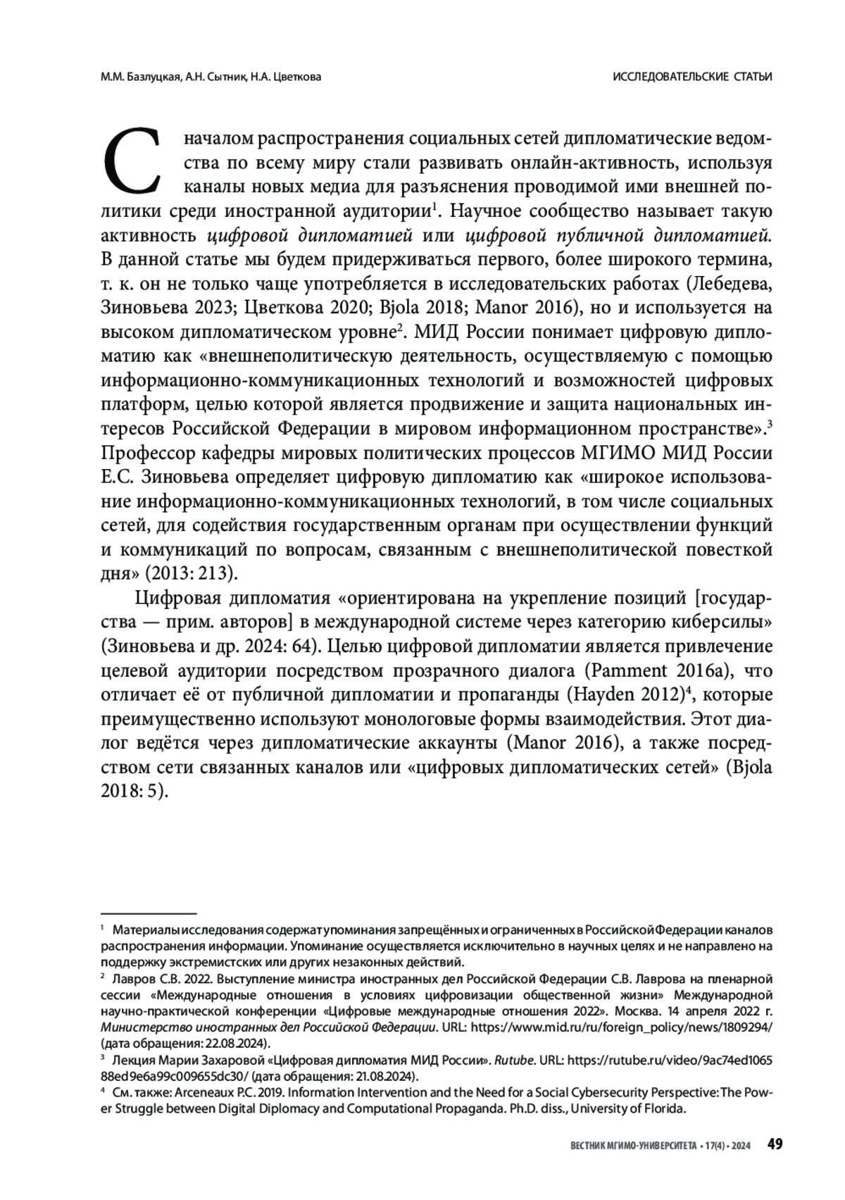 24. Зиновьева Е.С., Цветкова Н.А., Сидоренко Э.Л. и др. «Цифра» и искусственный интеллект на службе дипломатии: аналитический доклад. Московский государственный институт международных отношений (университет) Министерства иностранных дел Российской Федерации, Кафедра мировых политических процессов. - Москва: МГИМО-Университет, 2024. - 68 с.