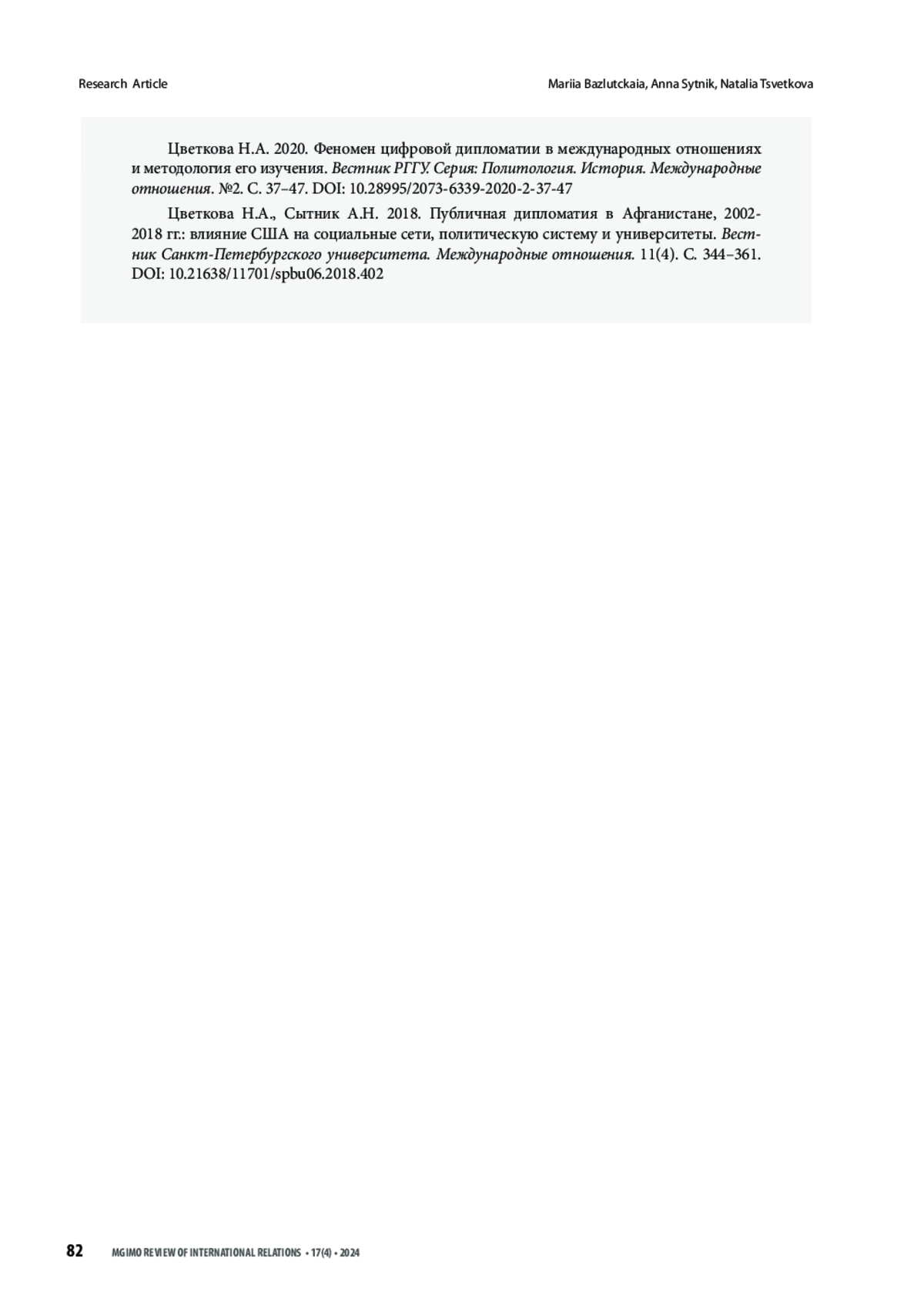 28. Цветкова Н.А., Сытник А.Н. 2018. Публичная дипломатия в Афганистане, 20022018 гг.: влияние США на социальные сети, политическую систему и университеты. Вестник Санкт-Петербургского университета. Международные отношения. 11(4). С. 344-361. https://doi.org/10.21638/11701/spbu06.2018.402