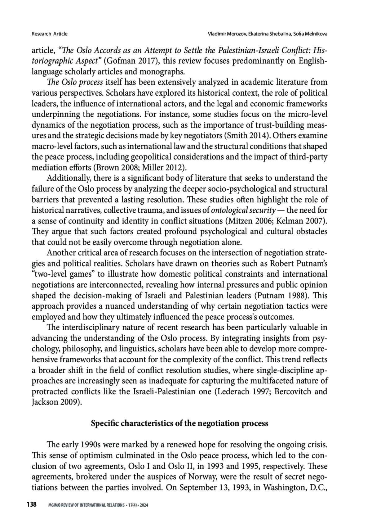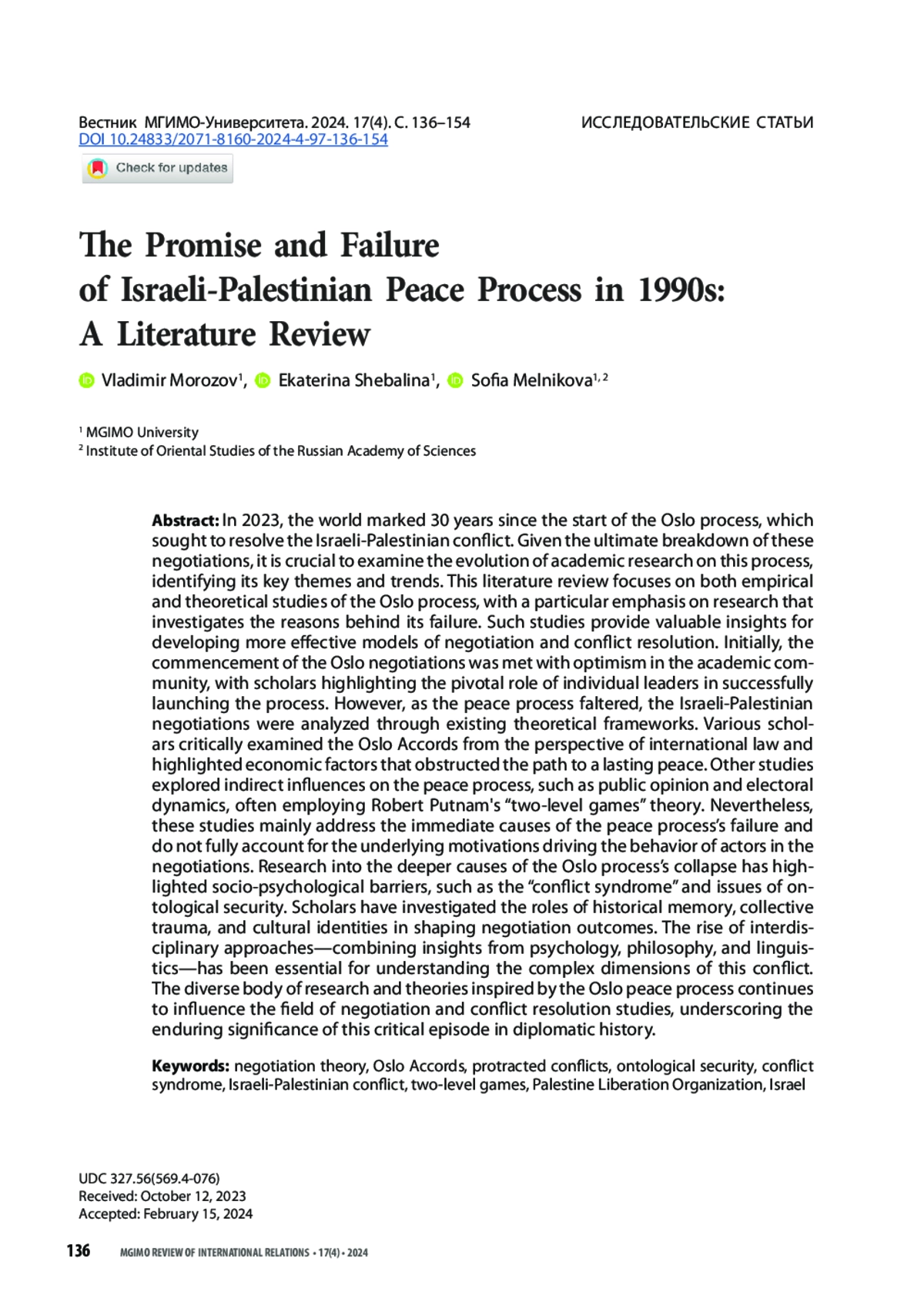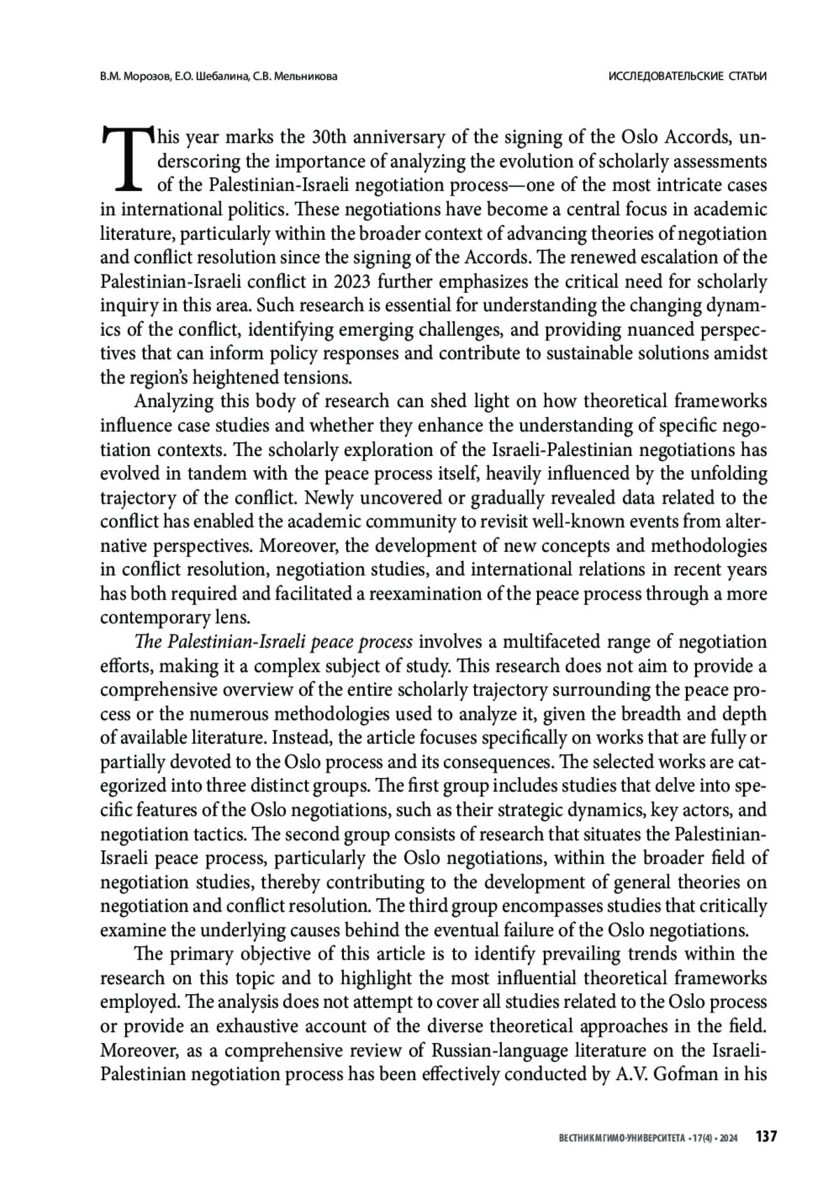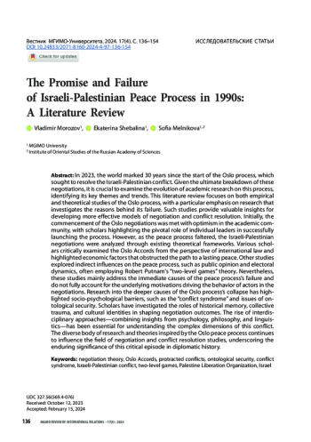 В 2023 году мир отметил 30-летие с момента начала процесса Осло, направленного на урегулирование израильско-палестинского конфликта. Учитывая итоговый провал этих переговорных усилий, уместно рассмотреть основные направления научных исследований этого процесса, определить их ключевые темы и тенденции. При анализе как эмпирических, так и теоретических работ, посвящённых процессу Осло, особое внимание уделяется исследованиям, выявляющим причины провала переговоров, поскольку они указывают перспективные направления для разработки более эффективных моделей ведения переговоров и разрешения конфликтов. Начало переговоров в Осло первоначально было встречено академическим сообществом с оптимизмом, причём учёные подчёркивали ключевую роль отдельных лидеров в успешном запуске процесса. Параллельно с тем, как мирный процесс заходил в тупик, израильско- палестинские переговоры были проанализированы в рамках существующих теоретических моделей, при этом исследователи критически оценивали соглашения в Осло с точки зрения международного права и выделяли экономические факторы, препятствовавшие достижению прочного мира. В других исследованиях рассматривались косвенные факторы, влияющие на мирный процесс, такие как общественное мнение и электоральная динамика, часто с опорой на теорию «двухуровневых игр» Роберта Патнэма. Однако эти исследования в первую очередь направлены на выявление непосредственных причин провала мирного процесса и не позволяют объяснить фундаментальные мотивы, лежащие в основе поведения участников переговорного процесса. Исследование глубинных причин провала процесса Осло привлекло внимание к социально- психологическим барьерам, включая «конфликтный синдром» и проблемы онтологической безопасности. Учёные исследовали влияние исторической памяти, коллективной травмы и культурной идентичности на исход переговоров. Появление междисциплинарных подходов, объединяющих психологию, философию и лингвистику, сыграло решающую роль в понимании сложных аспектов конфликта. Разнообразные теории, вдохновлённые мирным процессом в Осло, продолжают влиять на развитие исследований в области переговоров и урегулирования конфликтов, подчёркивая непреходящее значение этого поворотного момента в истории дипломатии.