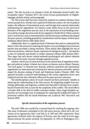 Some studies have contributed to the broader field of negotiation theory through an analysis of the Palestinian-Israeli peace process, particularly the Oslo process. These studies have advanced the understanding of negotiations by exploring concepts such as the zero-sum game and examining the relationship between theoretical frameworks and practical applications (Kibrik 2016).
