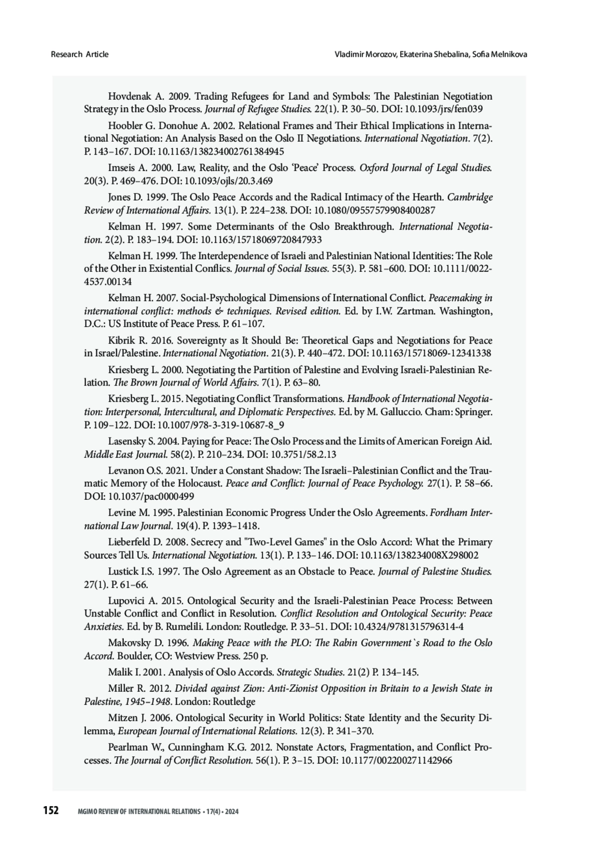 67. Zartman I.W. 1997. Explaining Oslo. International Negotiations. 2(2). P. 195-215. https://doi.org/10.1163/15718069720847942
