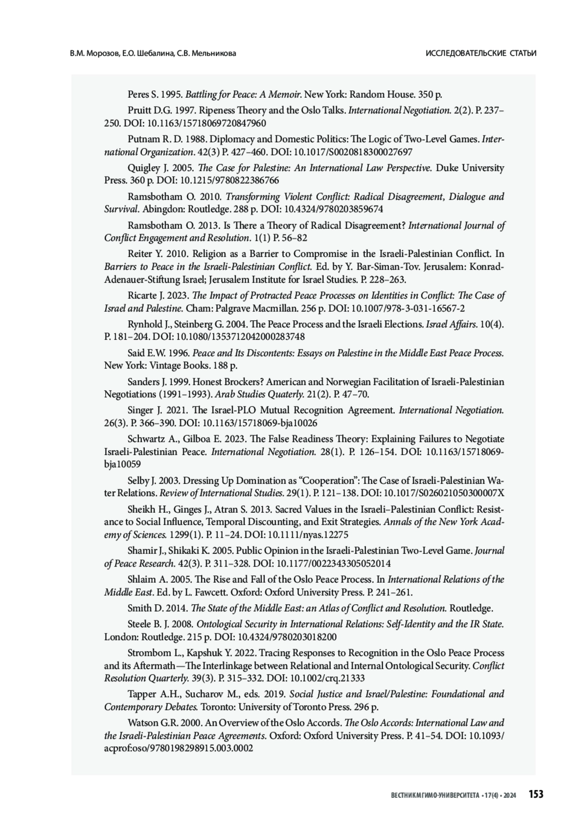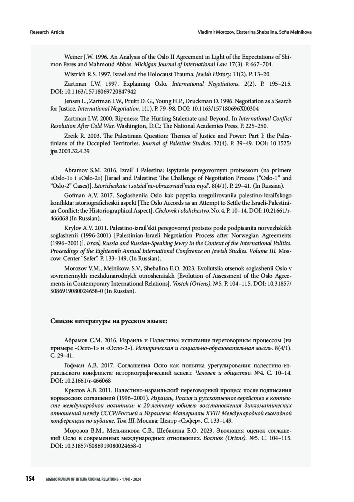 74. Морозов В.М., Мельникова С.В., Шебалина Е.О. 2023. Эволюция оценок соглашений Осло в современных международных отношениях. Восток (Oriens). 2023. № 5. С. 104-115. https://doi.org/10.31857/S086919080024658-0