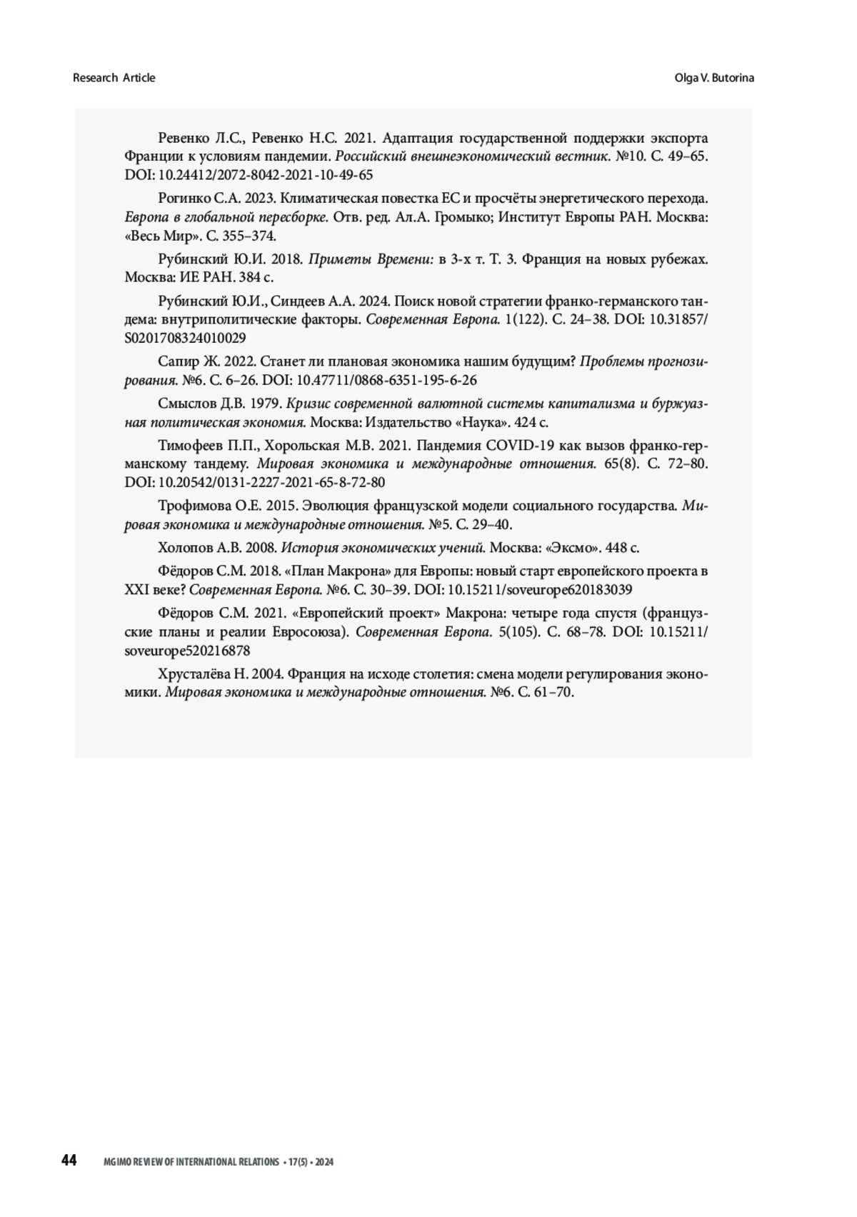 38. Ревенко Л.С., Ревенко Н.С. 2021. Адаптация государственной поддержки экспорта Франции к условиям пандемии. Российский внешнеэкономический вестник. №10. С. 49-65. https://doi.org/10.24412/2072-8042-2021-10-49-65