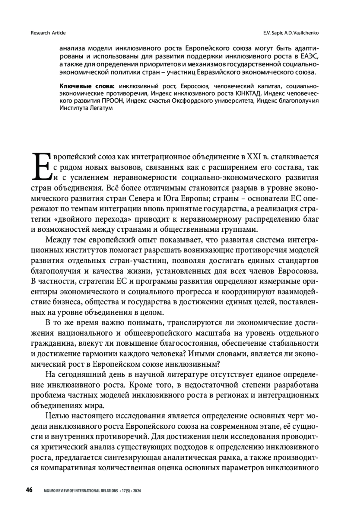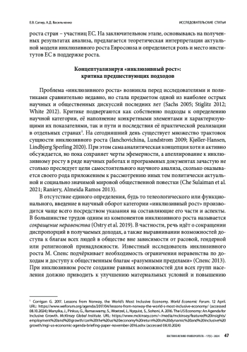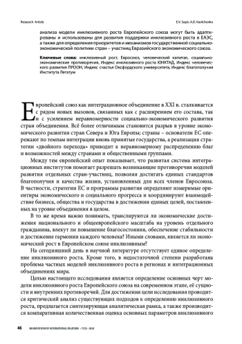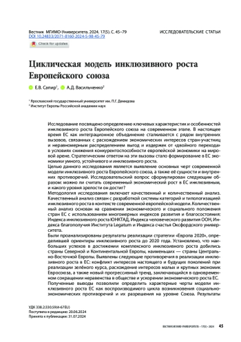 Исследование посвящено определению ключевых характеристик и особенностей инклюзивного роста Европейского союза на современном этапе. В настоящее время ЕС как интеграционное объединение сталкивается с рядом внутренних вызовов, связанных с расхождением экономических интересов стран-участниц и неравномерным распределением выгод и издержек от «двойного перехода» в условиях снижения конкурентоспособности европейской экономики на мировой арене. Стратегическим ответом на эти вызовы стало формирование в ЕС экономики умного, устойчивого и инклюзивного роста. Целью данного исследования является выявление основных черт современной модели инклюзивного роста Европейского союза, а также её сущности и внутренних противоречий. Исследовательский вопрос сформулирован следующим образом: можно ли считать современный экономический рост в ЕС инклюзивным, и какого уровня зрелости он достиг? Методология исследования включает качественный и количественный анализ. Качественный анализ связан с разработкой системы категорий и типологизацией инклюзивного роста в контексте современной европейской модели. Количественный анализ основан на сравнении экономического и социального положения стран ЕС с использованием многомерных индексов развития и благосостояния: Индекса инклюзивного роста ЮНКТАД, Индекса человеческого развития ООН, Индекса благополучия Института Legatum и Индекса счастья Оксфордского университета. Были проанализированы результаты реализации стратегии «Европа 2020», определившей ориентиры инклюзивного роста до 2020 года. Установлено, что наибольших успехов в достижении комплексного инклюзивного роста добились страны Северной и Континентальной Европы, наименьших — страны Центрально-Восточной Европы. Выявлены следующие противоречия в реализации инклюзивного роста в ЕС: конфликт интересов настоящего и будущих поколений при реализации «зелёного курса», расхождение интересов малых и крупных экономик Евросоюза, а также новый прогрессивный тренд, заключающийся в одновременном сокращении неравенства в обществе и ускорении экономического роста ЕС. Полученные выводы позволили определить характерные черты модели инклюзивного роста ЕС как воспроизводимого цикла возникновения социально-экономических противоречий и их разрешения на уровне Союза. Результаты анализа модели инклюзивного роста Европейского союза могут быть адаптированы и использованы для развития поддержки инклюзивного роста в ЕАЭС, а также для определения приоритетов и механизмов государственной социально-экономической политики стран – участниц Евразийского экономического союза.