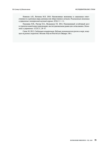 36. Пахомова Н.В., Рихтер К.К., Малышков Г.Б. 2016. Инклюзивный устойчивый рост и стратегия новой индустриализации: институциональные рамки для согласования. Экономика и управление. 1(123). С. 29-37.