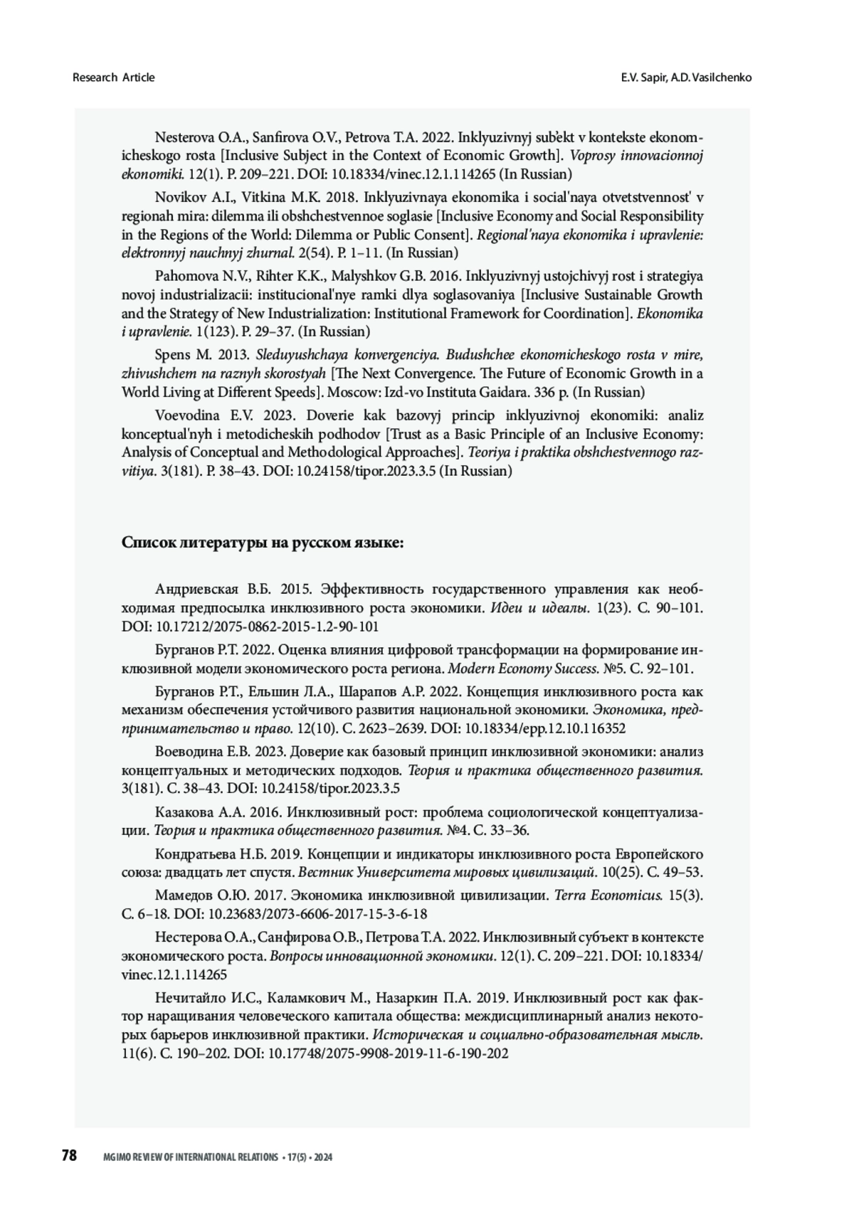 33. Нестерова О.А., Санфирова О.В., Петрова Т.А. 2022. Инклюзивный субъект в контексте экономического роста. Вопросы инновационной экономики. 12(1). С. 209-221. https://doi.org/10.18334/ vinec.12.1.114265