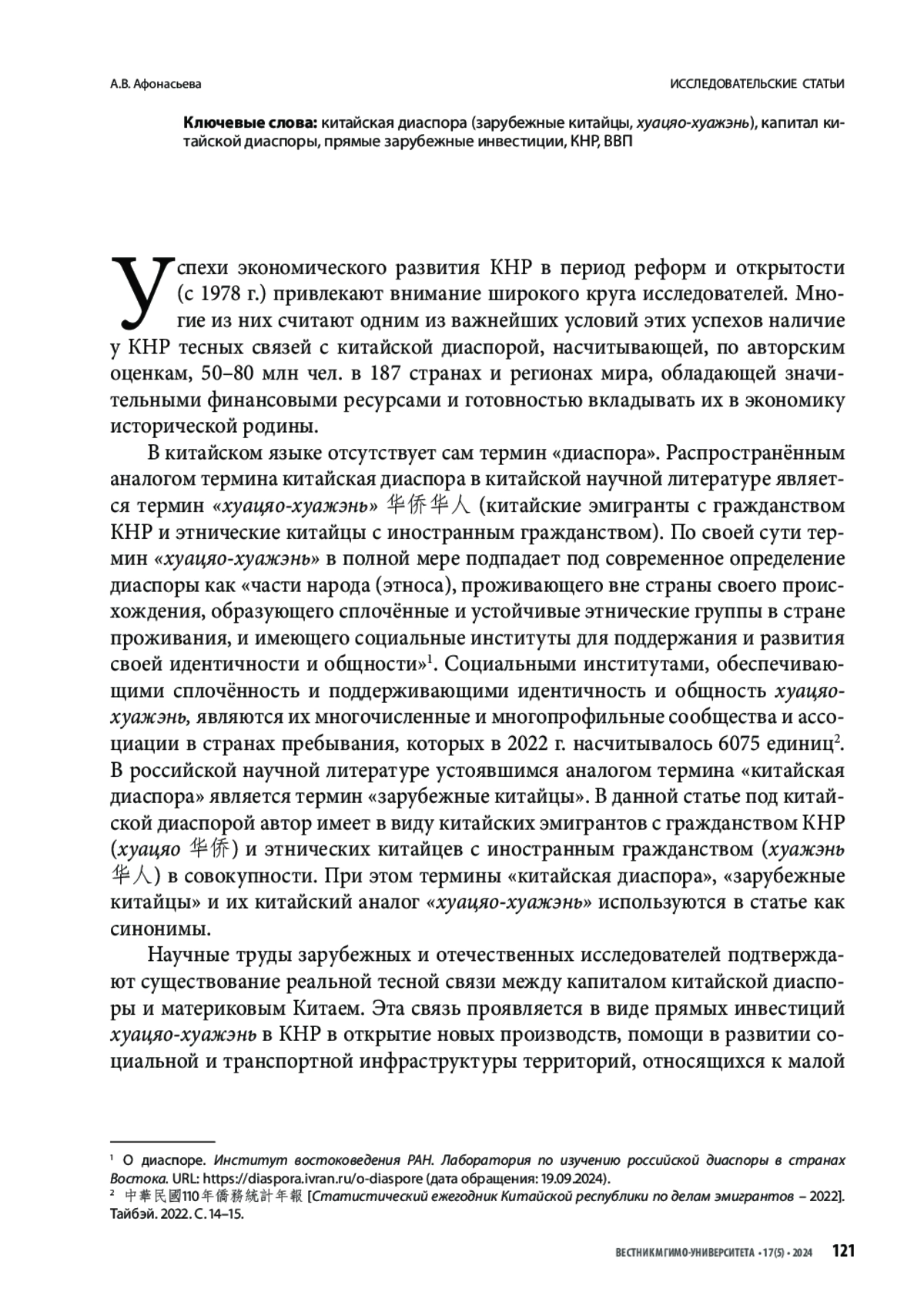 Статья посвящена проблеме оценки капитала китайской диаспоры (зарубежных китайцев) в мире. Цель статьи – оценить объём этого капитала в абсолютном выражении и определить его способность влиять на экономическое развитие отдельных стран и регионов мира, в том числе на экономику КНР. Автор поставил задачи собрать и обобщить все доступные оценки капитала китайской диаспоры, которые проводились учёными в период с 1949 г. и позднее; изучить имеющиеся методики оценки и на их основе выработать собственные предложения по оценке капитала китайской диаспоры в 2015–2023 гг.; на основе авторских расчётов составить карты распределения этого капитала по странам и регионам мира в абсолютных цифрах и в процентном отношении к ВВП отдельных стран и регионов; выявить основные отрасли предпринимательской деятельности и определить степень влияния китайской диаспоры на отраслевых рынках отдельных стран и регионов; сравнить доли капитала китайской диаспоры и накопленных прямых зарубежных инвестиций КНР в ВВП принимающих стран и регионов мира. Работа основана на данных китайской и международной статистики. Расчёт капитала китайской диаспоры в 2015–2023 гг. и его географическое распределение базируется на данных о рыночной капитализации и стоимости крупных предприятий зарубежных китайцев. Для проведения расчётов автор определяет восемь стран и регионов с высокой степенью бизнес-активности зарубежных китайцев (Индонезия, Малайзия, Сингапур, Таиланд, Филиппины, США, Гонконг и Фиджи), процентное соотношение крупного бизнеса и СМП (средних и малых предприятий) зарубежных китайцев в этих восьми и во всех остальных странах и регионах, а также учитывает условие, что 75% капитала китайской диаспоры приходится на указанные восемь стран и регионов с высокой степенью бизнес-активности китайской диаспоры. Для качественной оценки капитала китайской диаспоры использован метод сравнительного анализа. В настоящее время капитал китайской диаспоры оценивается автором минимум в 5 трлн долл. (без учёта активов предприятий Гонконга, Макао и Тайваня, не имеющих отношения к китайской диаспоре). Он размещён на пяти континентах, способен заметно влиять на экономику более чем 50 стран мира, включая КНР, и является существенным дополнительным финансовым ресурсом КНР за рубежом, особенно в странах, где КНР не имеет возможности напрямую реализовывать свои экономические проекты.