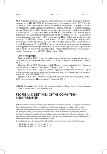 История Коминтерна окутана множеством тайн. Одна из них связана с судьбой Ниило Карловича Виртанена. Методологическая традиция русской исторической школы в области персональной истории, на которую ориентируется автор, основана на нарративе, что каждое историческое явление имеет две стороны: с одной – это момент целого, с другой – условие, определяющее судьбу личности в тот или иной период истории.