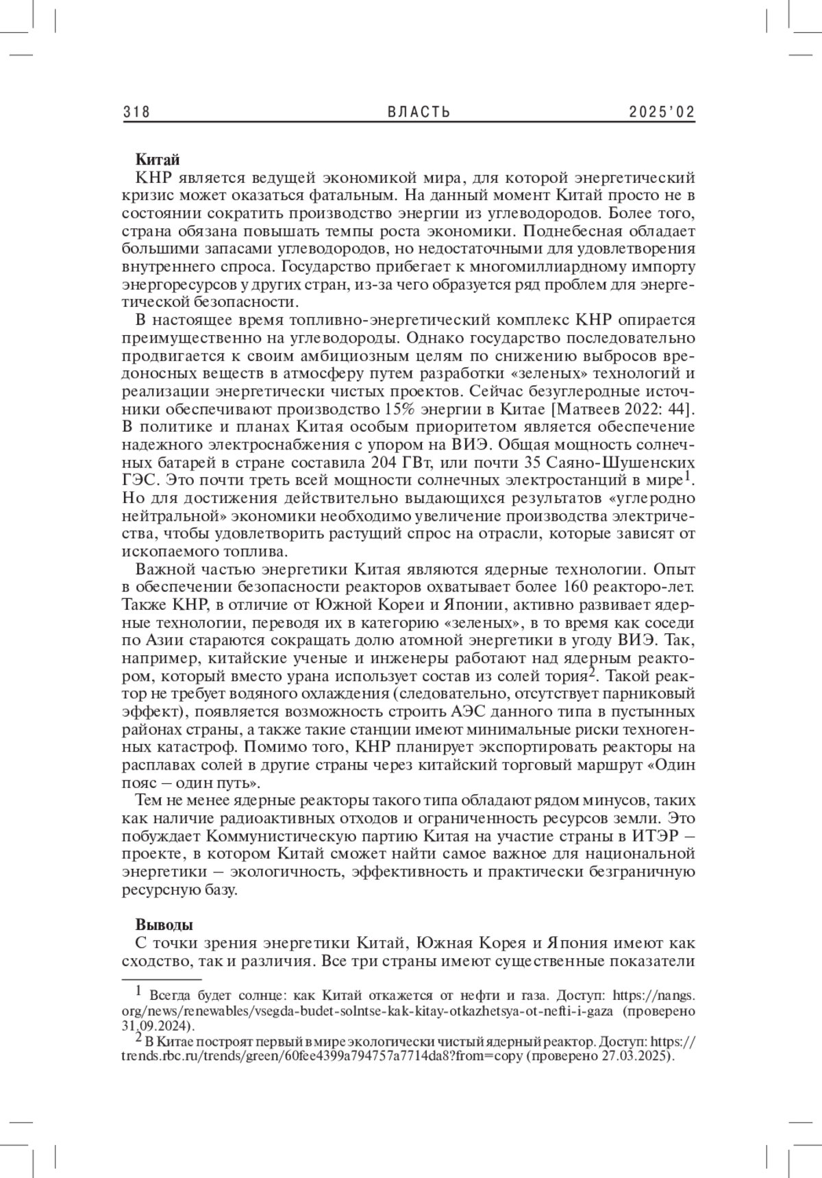 1. 	Матвеев В.А. 2022. Внешние и внутренние вызовы современной энергетической политики Китая. - Современная энергетическая политика Китая: внешние и внутренние вызовы. М.: Изд-во ИДВ РАН. С. 38-59.