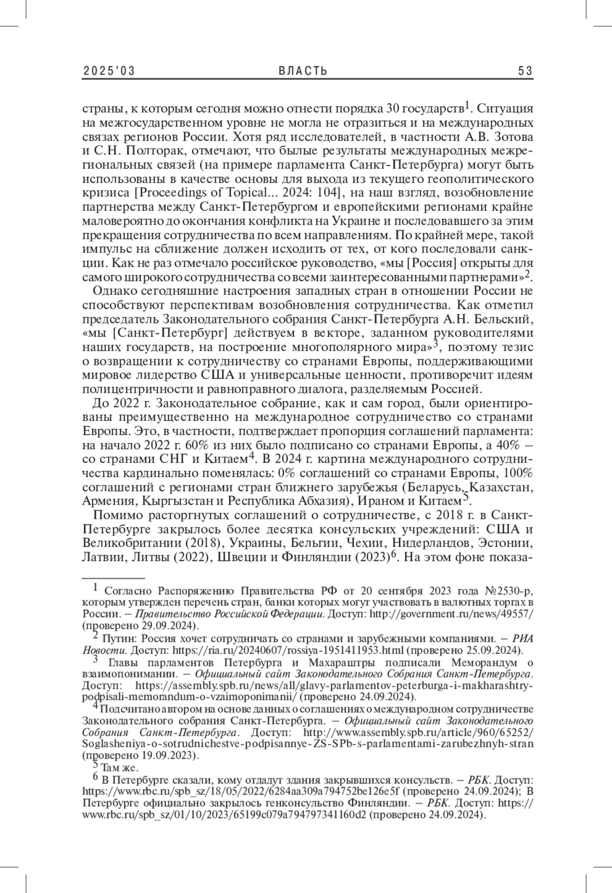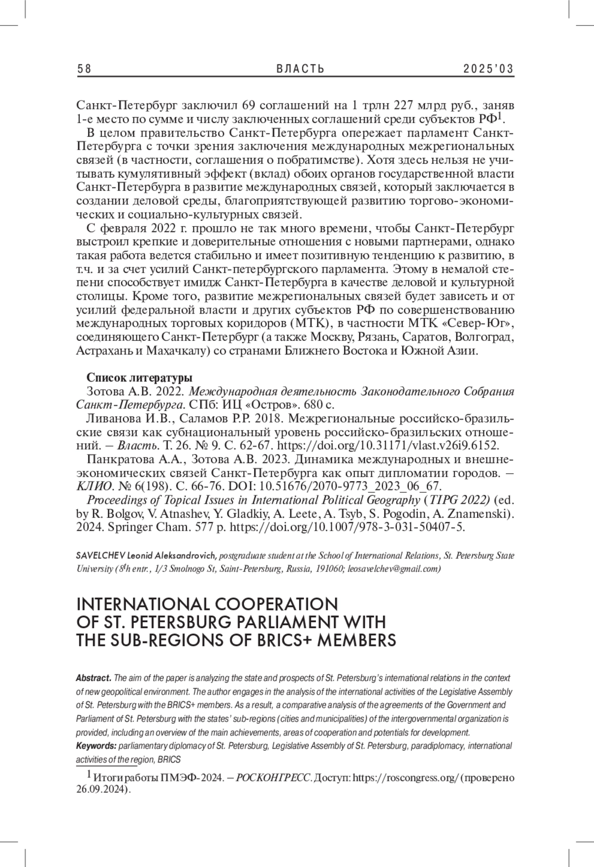 1. 	Зотова А.В. 2022. Международная деятельность Законодательного Собрания Санкт-Петербург. СПб: ИЦ “Остров”. 680 с. EDN: GIMPRJ