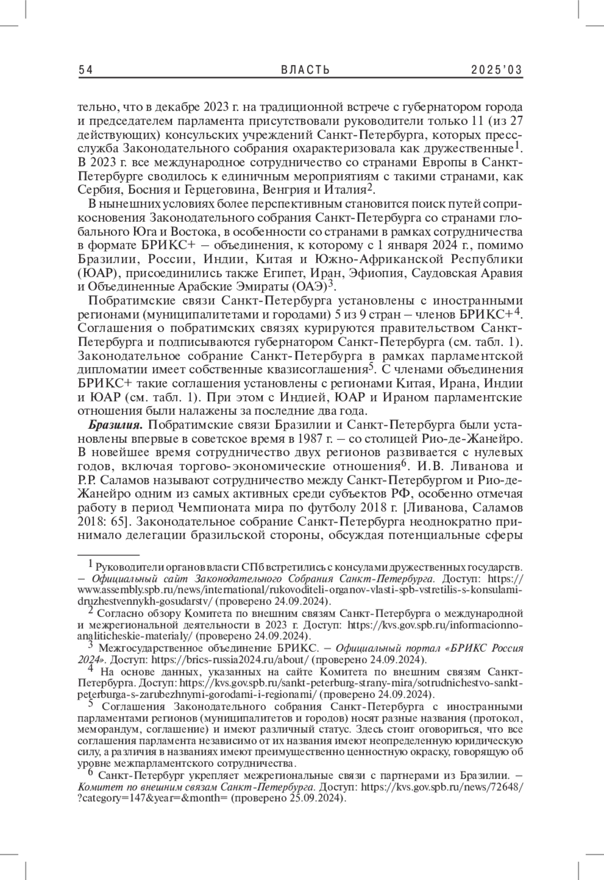 2. 	Ливанова И.В., Саламов Р.Р. 2018. Межрегиональные российско-бразильские связи как субнациональный уровень российско-бразильских отношений. - Власть. Т. 26. № 9. С. 62-67. DOI: 10.31171/vlast.v26i9.6152 EDN: YWGTCH