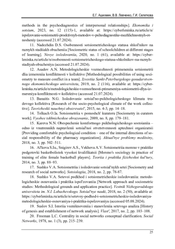 12. 	Асадов, А.Н. Методологические возможности применения социометрии для измерения конфликтности в коллективе [Электронный ресурс] / А.Н. Асадов // Известия СПбГЭУ. - 2019. - № 2 (116). - URL: https://cyberleninka.ru/article/n/metodologicheskie-vozmozhnosti-primeneniya-sotsiometrii-dlya-izmereniya-konfliktnosti-v-kollektive (дата обращения: 21.07.2024).
