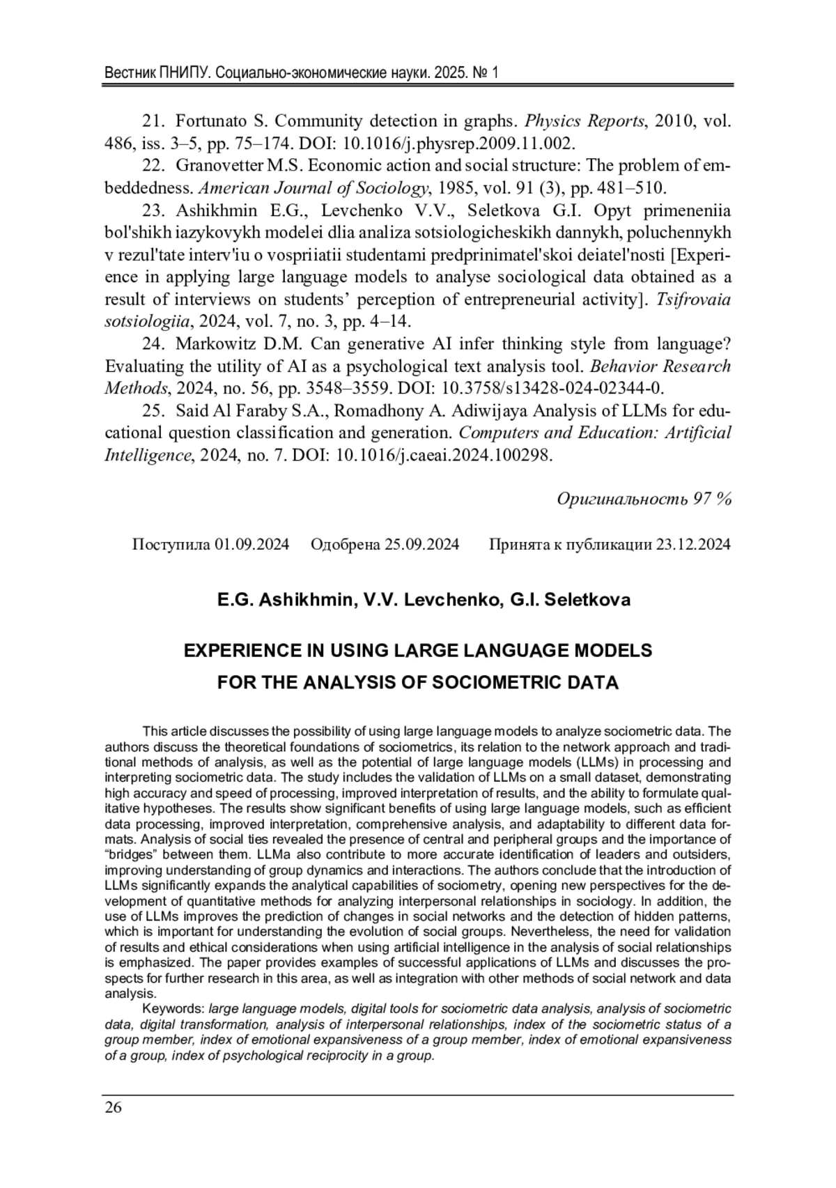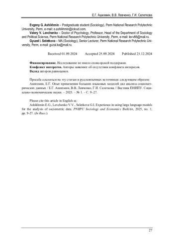 23. 	Ашихмин, Е.Г. Опыт применения больших языковых моделей для анализа социологических данных, полученных в результате интервью о восприятии студентами предпринимательской деятельности / Е.Г. Ашихмин, В.В. Левченко, Г.И. Селеткова // Цифровая социология. - 2024. - Т. 7, № 3. - С. 4-14.  EDN: NAFPHL