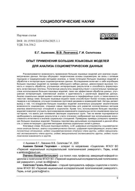 Рассматривается возможность применения больших языковых моделей для анализа социометрических данных. Авторы обсуждают теоретические основы социометрии, ее связь с сетевым подходом и традиционными методами анализа, а также потенциал больших языковых моделей в обработке и интерпретации социометрических данных. Исследование включает в себя апробацию больших языковых моделей на примере небольшого набора данных, демонстрируя высокую точность и скорость обработки, улучшенную интерпретацию результатов и способность формулировать качественные гипотезы. Полученные результаты свидетельствуют о значительных преимуществах использования больших языковых моделей, таких как эффективная обработка данных, улучшенная интерпретация, комплексный анализ и адаптивность к различным форматам данных. Анализ социальных связей выявил наличие центральных и периферийных групп, а также важность «мостов» между ними. Большие языковые модели также способствуют более точному выявлению лидеров и аутсайдеров, улучшая понимание групповой динамики и взаимодействий. Авторы делают вывод о том, что внедрение больших языковых моделей значительно расширяет аналитические возможности социометрии, открывая новые перспективы для развития количественных методов анализа межличностных отношений в социологии. Кроме того, использование больших языковых моделей позволяет улучшить прогнозирование изменений в социальных сетях и выявление скрытых паттернов, что важно для понимания эволюции социальных групп. Тем не менее подчеркивается необходимость валидации результатов и учета этических соображений при использовании искусственного интеллекта в анализе социальных отношений. Приведены примеры успешного применения больших языковых моделей. Показаны перспективы дальнейших исследований в данной области, а также интеграция с другими методами анализа социальных сетей и данных.