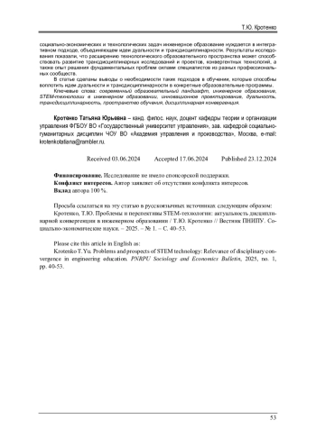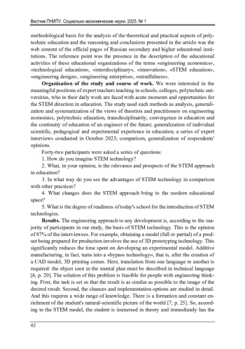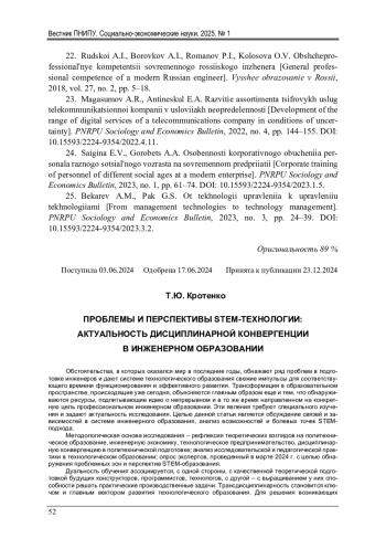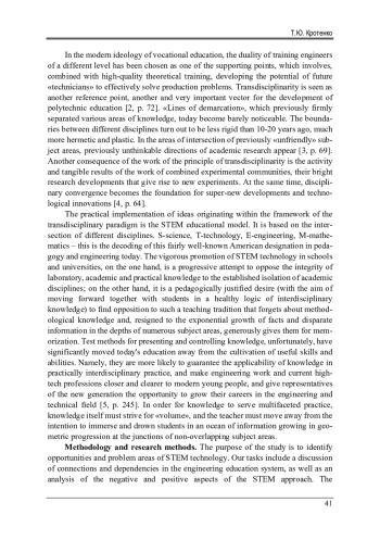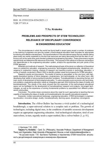Обстоятельства, в которых оказался мир в последние годы, обнажают ряд проблем в подготовке инженеров и дают системе технологического образования свежие импульсы для соответствующего времени функционирования и эффективного развития. Трансформации в образовательном пространстве, происходящие уже сегодня, объясняются главным образом еще и тем, что обнаруживаются ресурсы, подпитывающие идею о непрерывном и в то же время направленном на конкретную цель профессиональном инженерном образовании. Эти явления требуют специального изучения и задают актуальность исследования. Целью данной статьи является обсуждение связей и зависимостей в системе инженерного образования, анализ возможностей и болевых точек STEM-подхода. Методологическая основа исследования - рефлексия теоретических взглядов на политехническое образование, инженерную экономику, технологическое предпринимательство, дисциплинарную конвергенцию в политехнической подготовке; анализ исследовательской и педагогической практики в технологическом образовании; опрос экспертов, проведенный в марте 2024 г. с целью обнаружения проблемных зон и перспектив STEM-образования. Дуальность обучения ассоциируется, с одной стороны, с качественной теоретической подготовкой будущих конструкторов, программистов, технологов, с другой - с выращиванием у них способности решать практические производственные задачи. Трансдисциплинарность становится ключом и главным вектором развития технологического образования. Для решения возникающих социально-экономических и технологических задач инженерное образование нуждается в интегративном подходе, объединяющем идеи дуальности и трансдисциплинарности. Результаты исследования показали, что расширению технологического образовательного пространства может способствовать развитие трансдисциплинарных исследований и проектов, конвергентных технологий, а также опыт решения фундаментальных проблем силами специалистов из разных профессиональных сообществ. В статье сделаны выводы о необходимости таких подходов в обучении, которые способны воплотить идеи дуальности и трансдисциплинарности в конкретные образовательные программы.